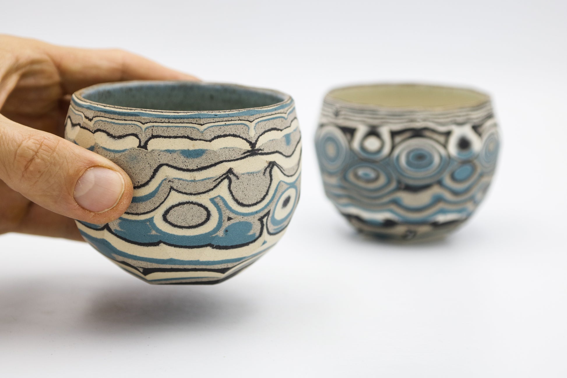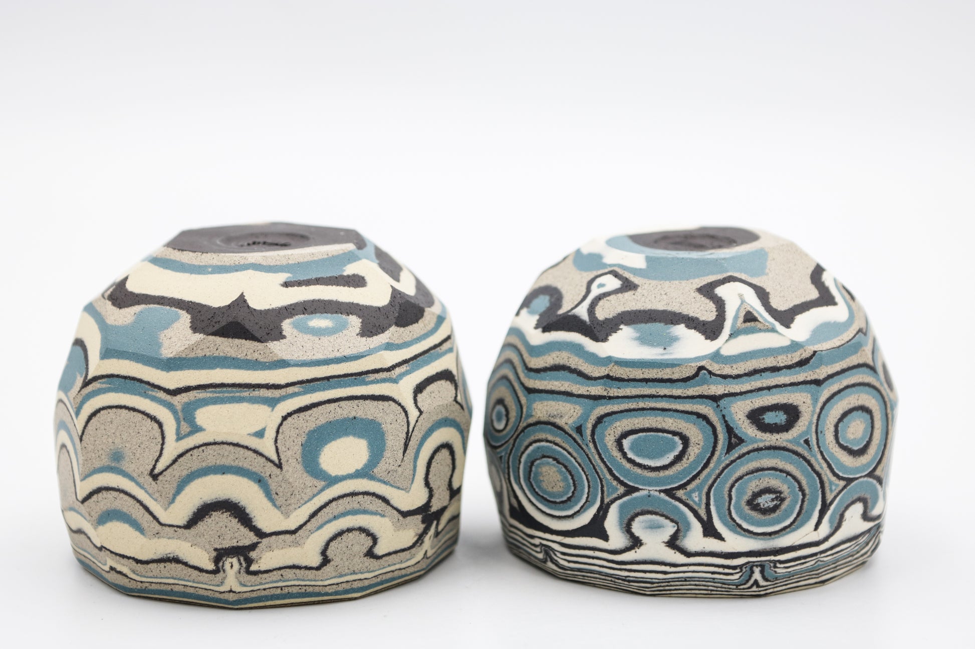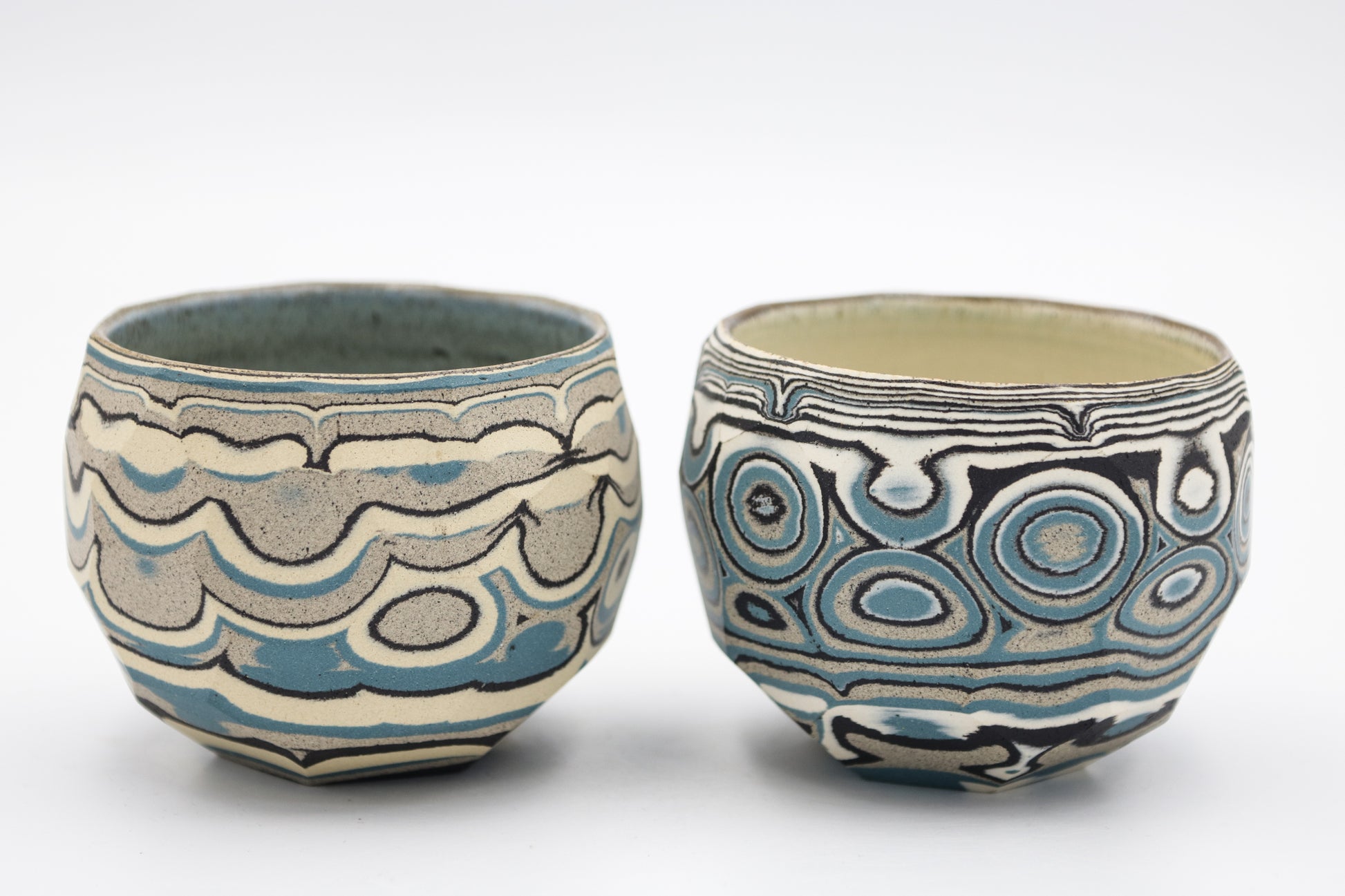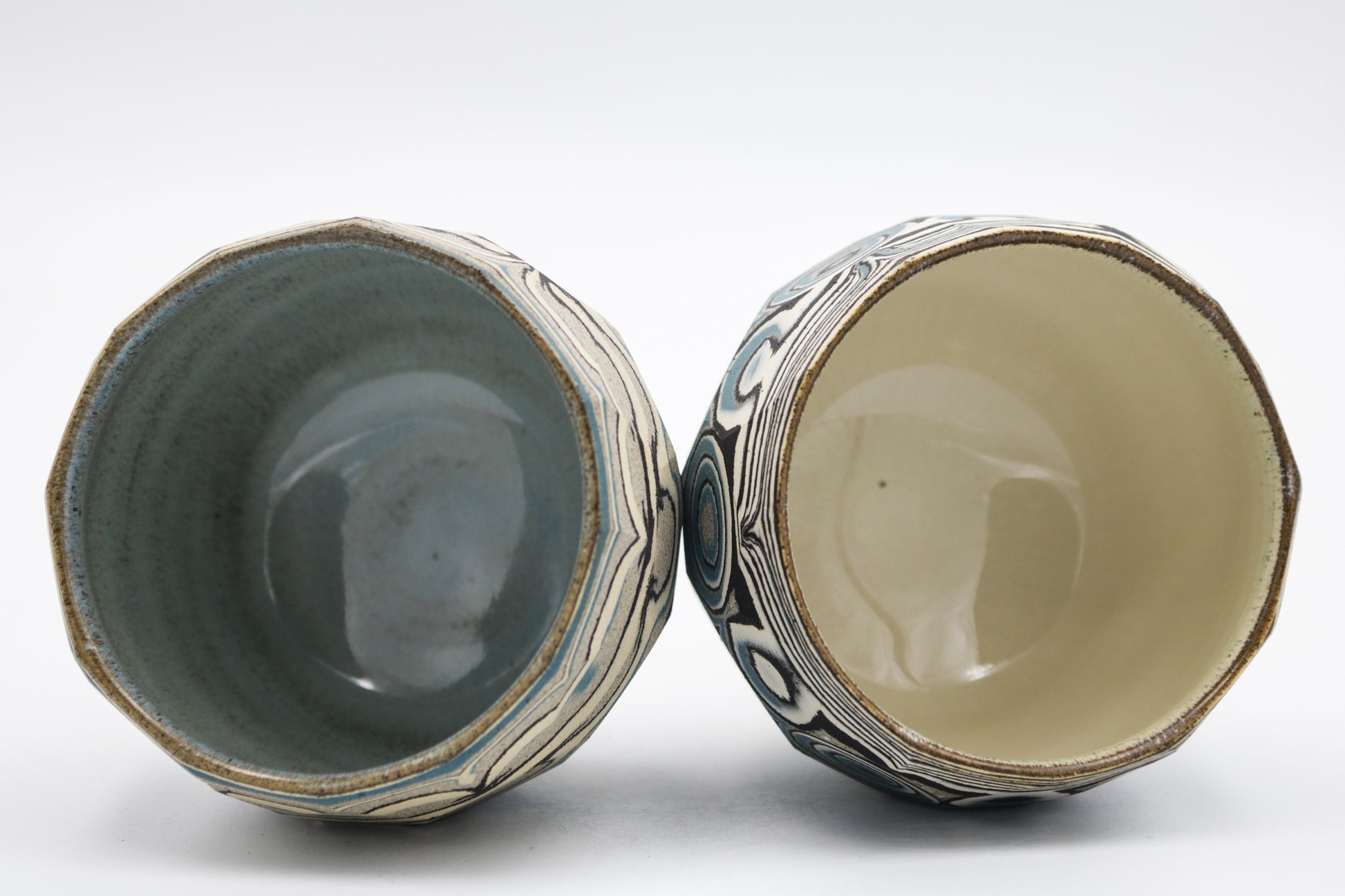 Hand thrown and cut, black, beige, white, gray and blue mixed stoneware cup set of two.
