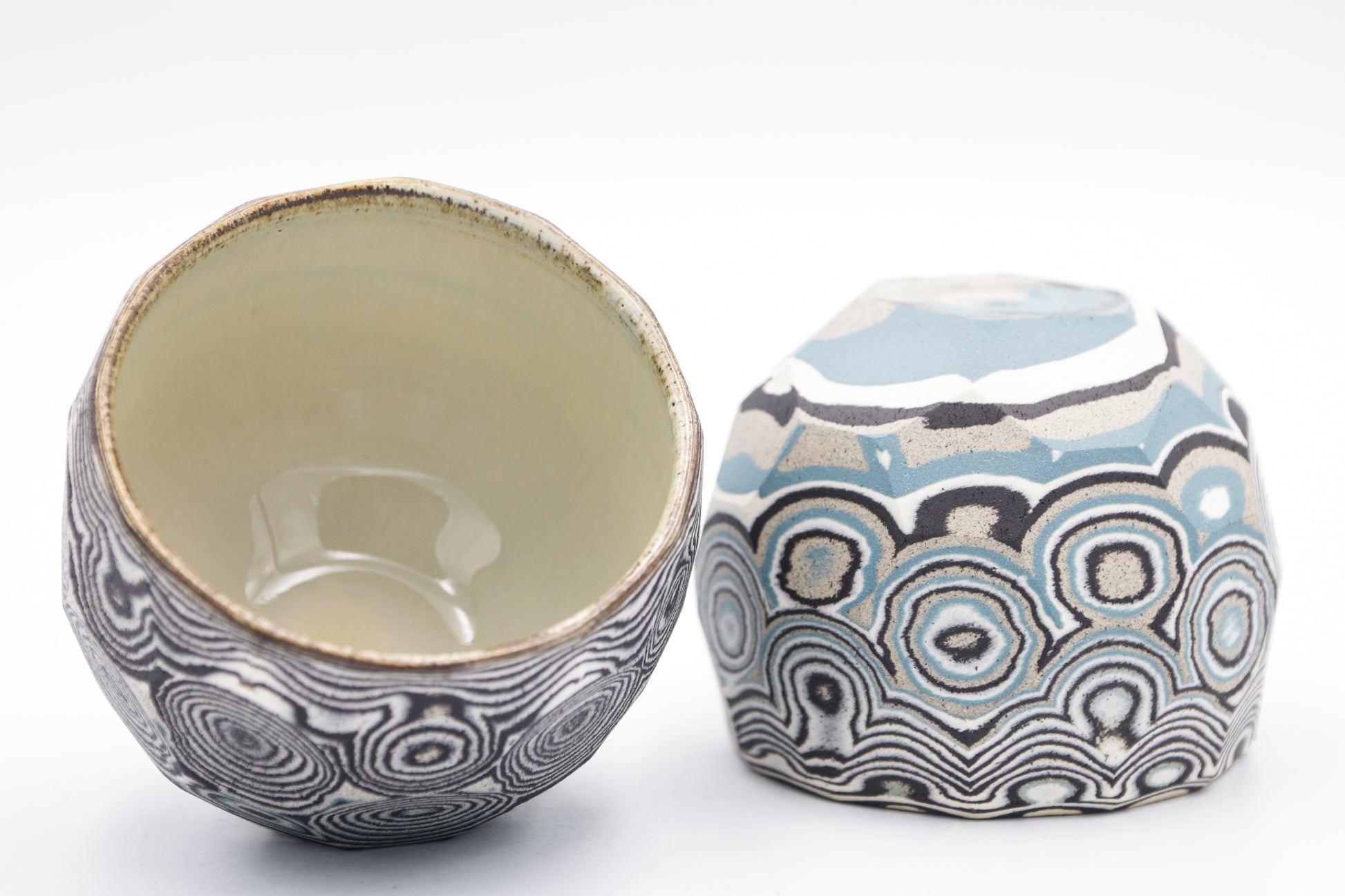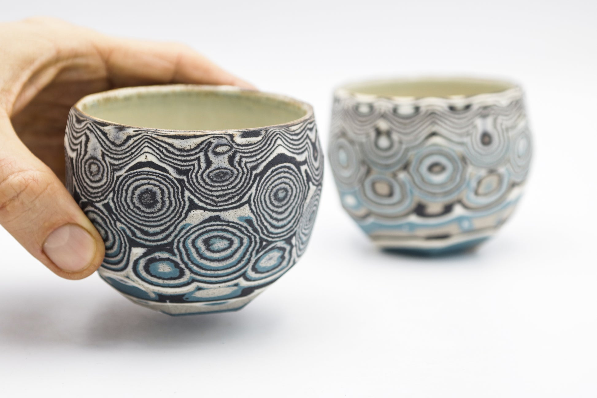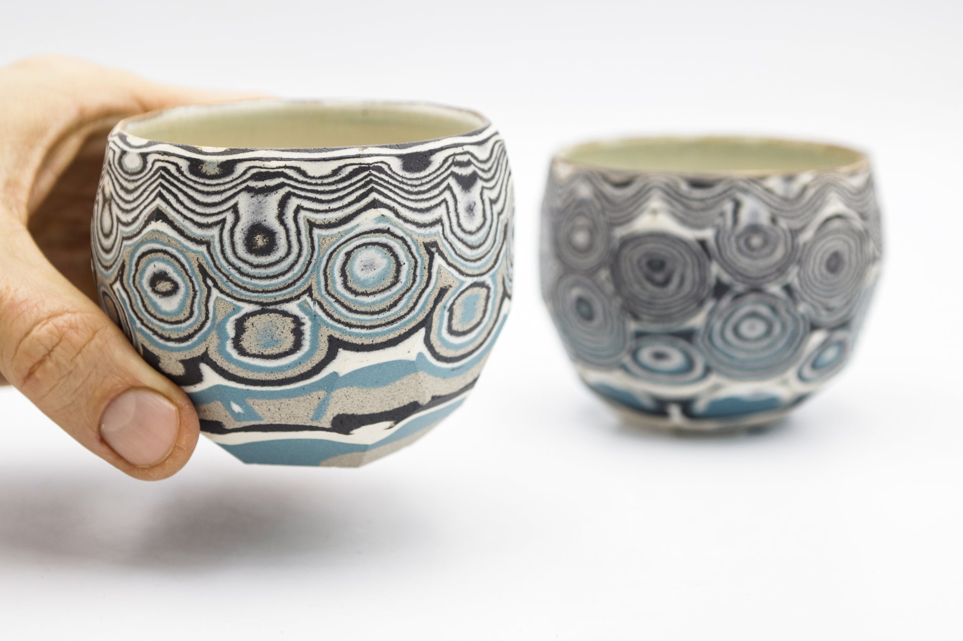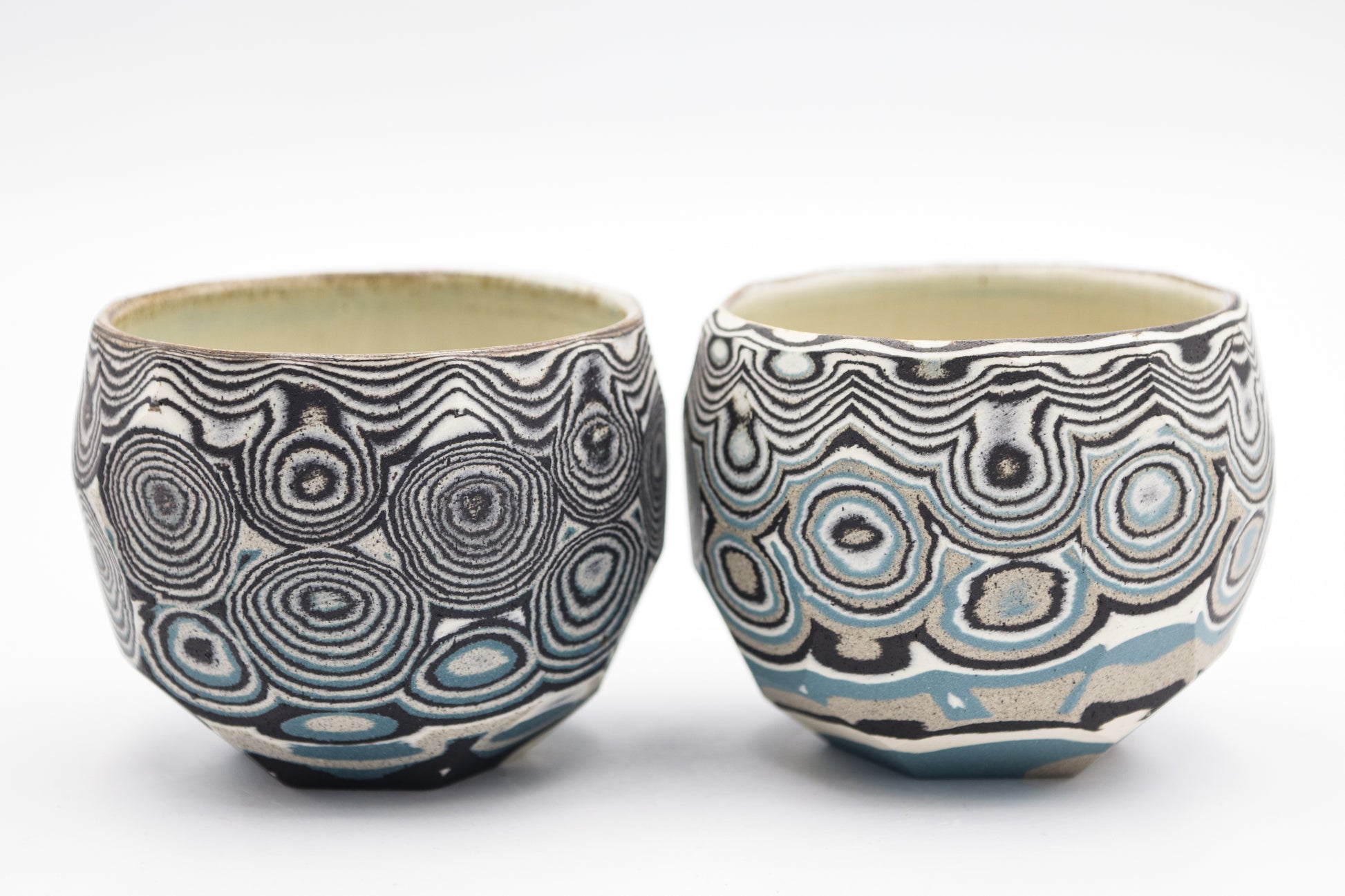 Hand thrown and cut, black, white, gray and blue mixed stoneware cup set of two.