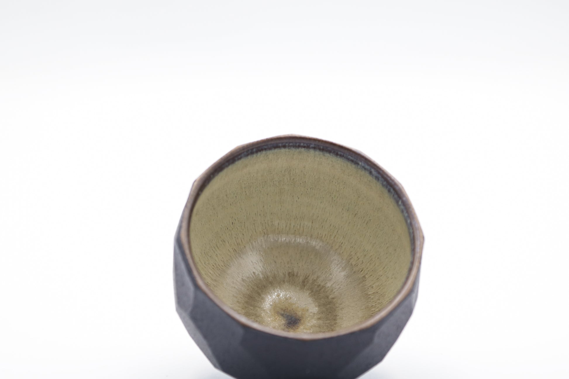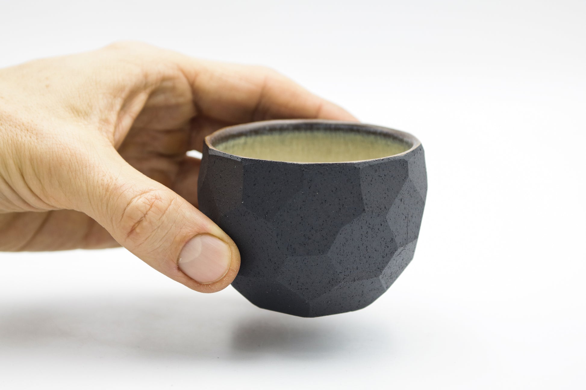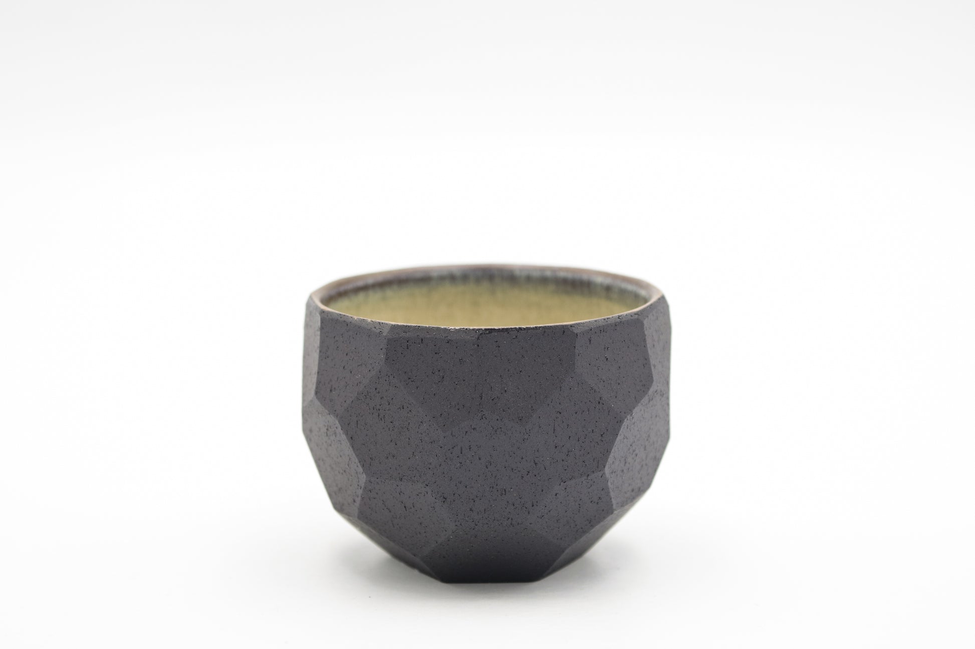 Hand thrown and cut, faceted black stoneware cup. Glazed inside. Each piece may be slightly different due to the handmade process.
