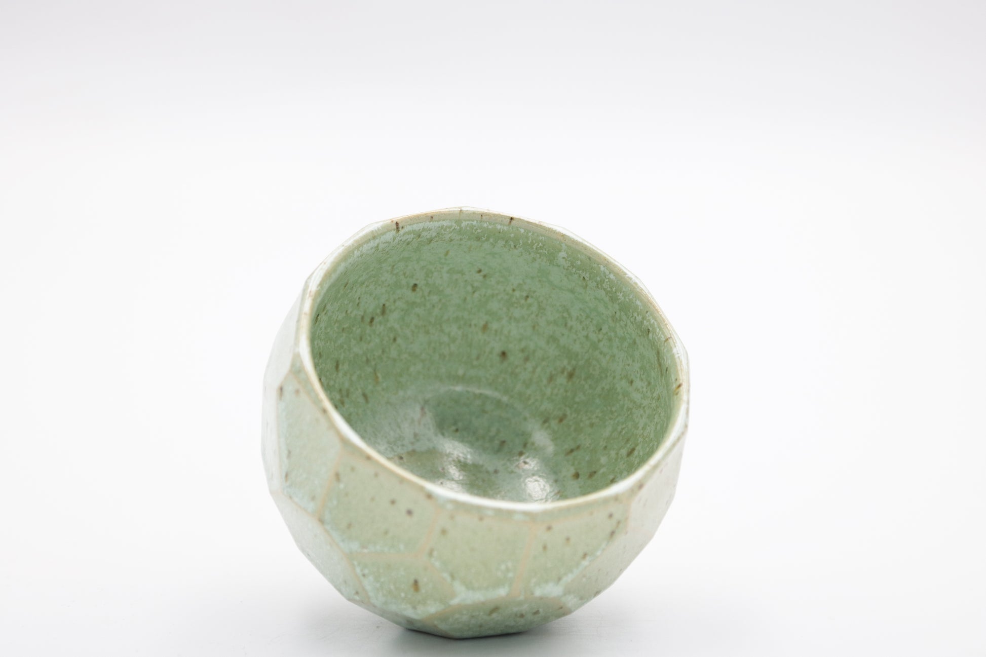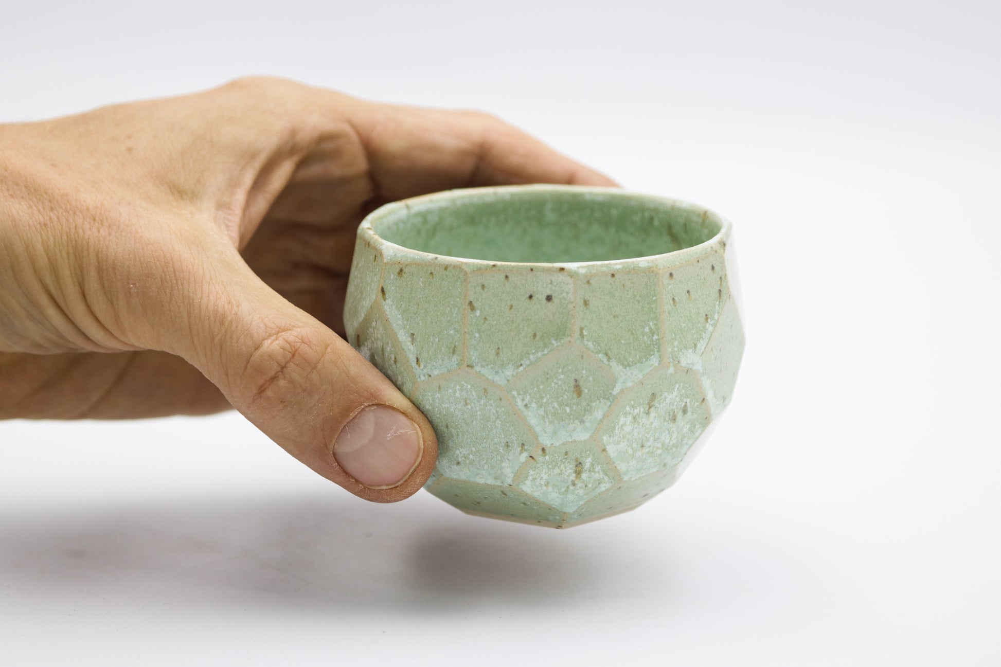 Hand thrown and cut, faceted stoneware cup. Glazed inside and outside. Each piece may be slightly different due to the handmade process.