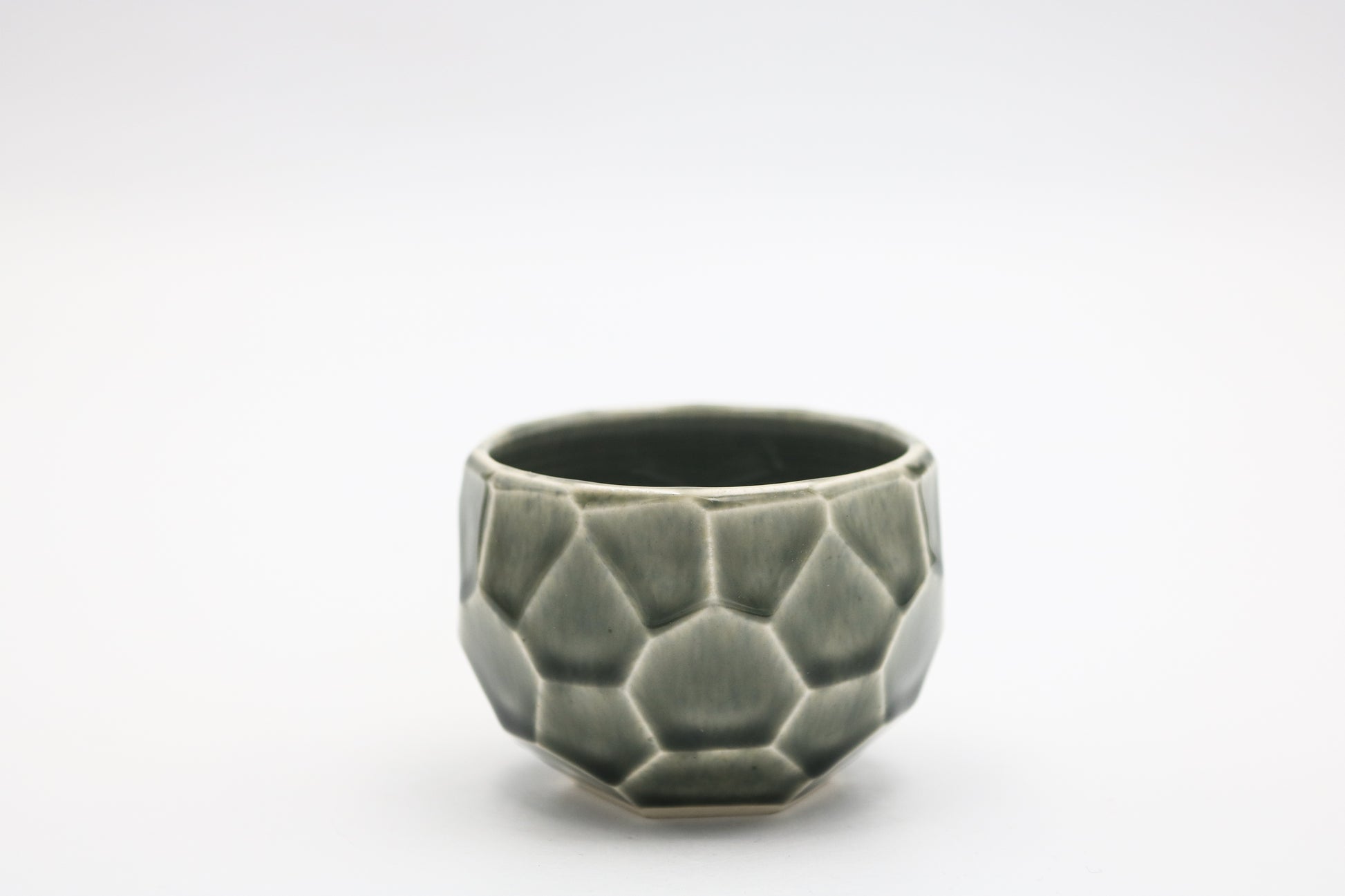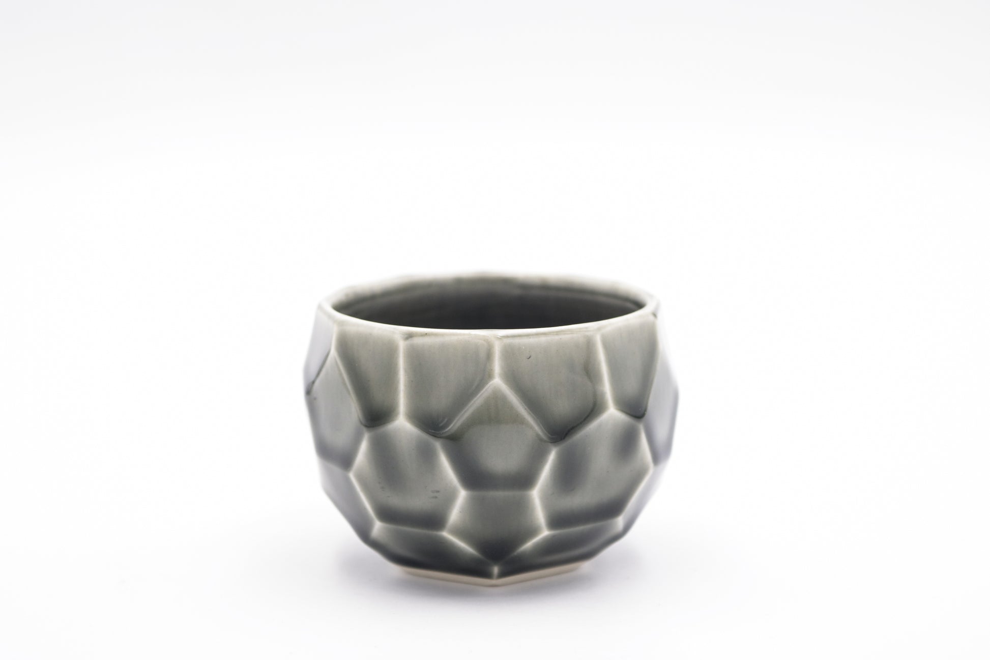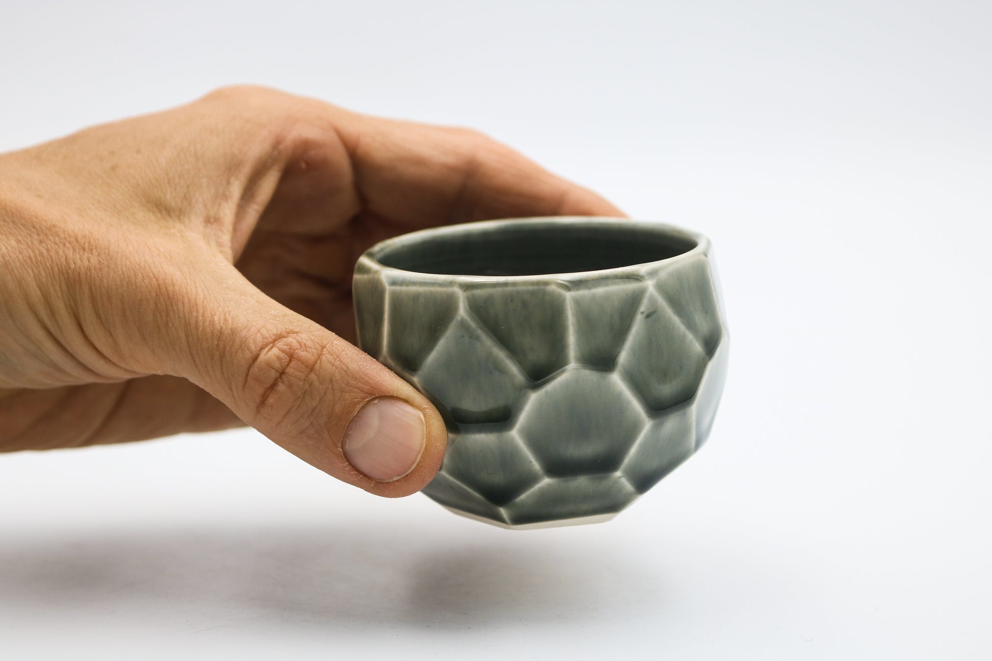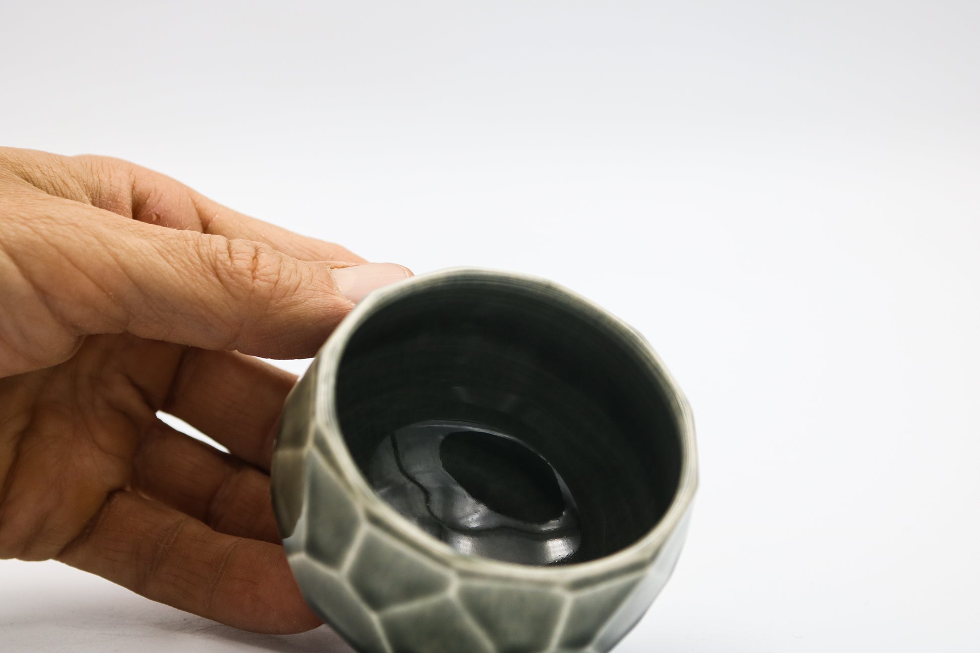 Hand thrown and cut, faceted stoneware cup. Glazed inside and outside. Each piece may be slightly different due to the handmade process.