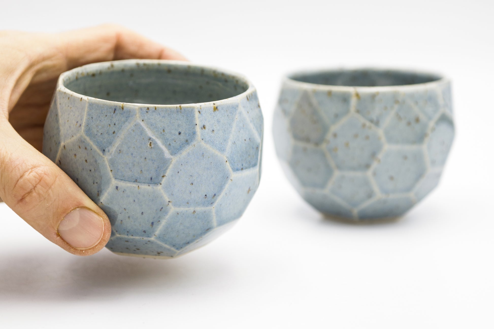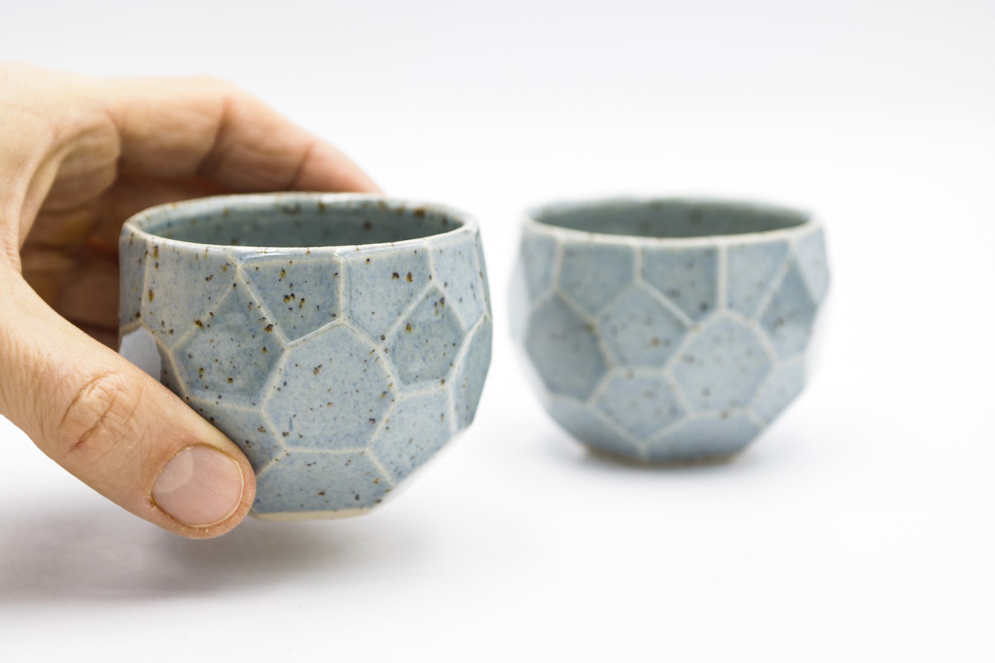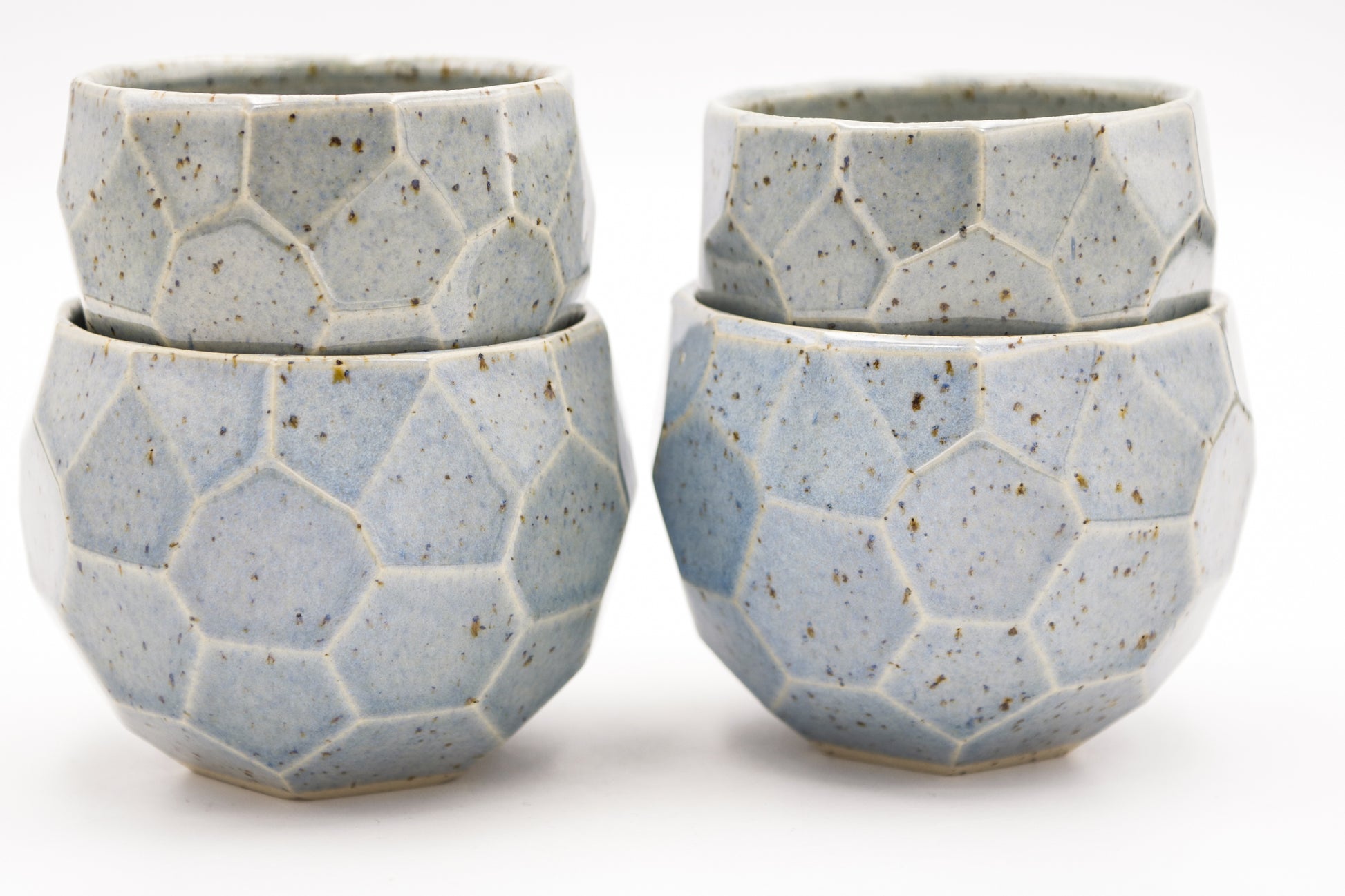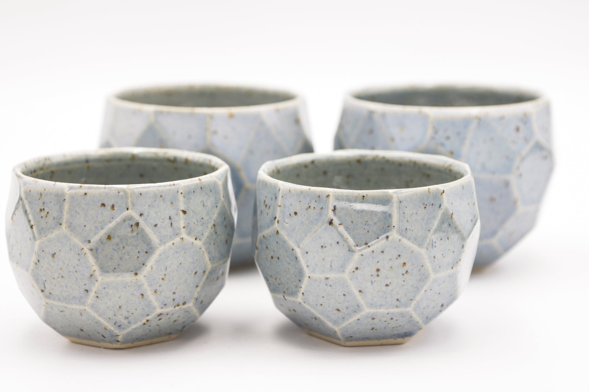 Set of 4 hand thrown and cut, faceted stoneware cups. Glazed inside and outside.