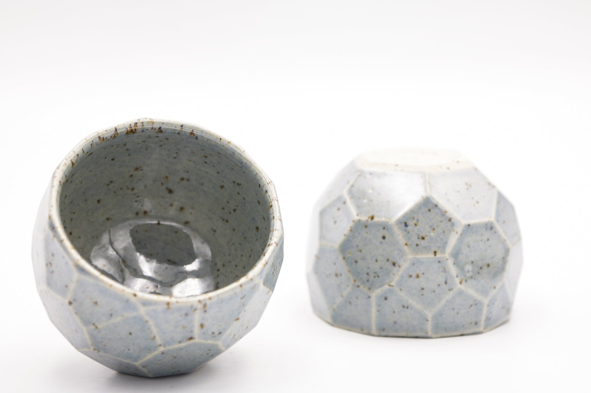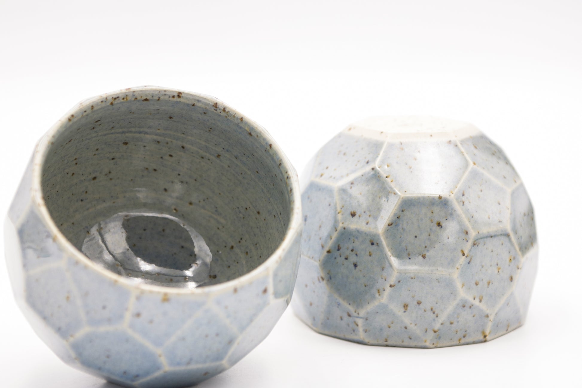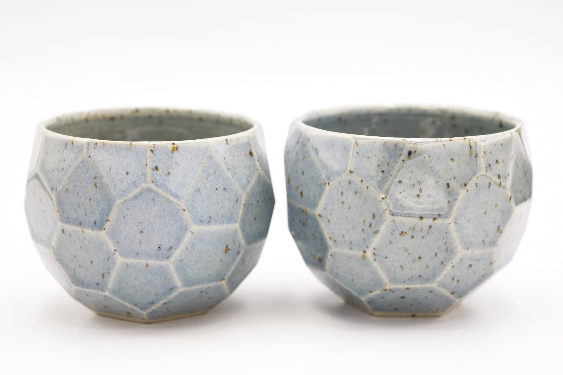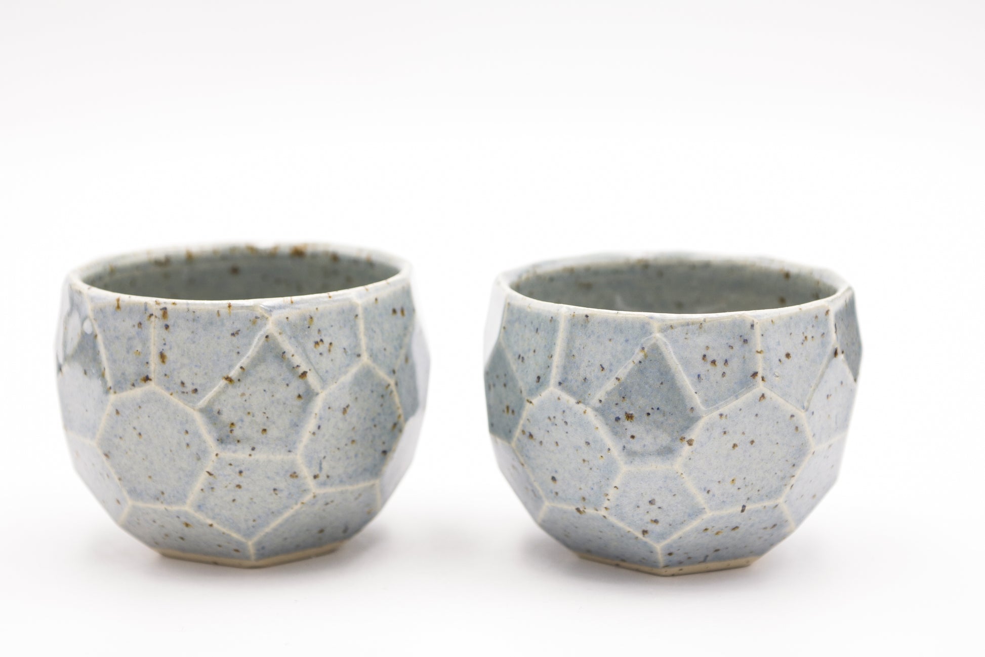 Set of 4 hand thrown and cut, faceted stoneware cups. Glazed inside and outside.
