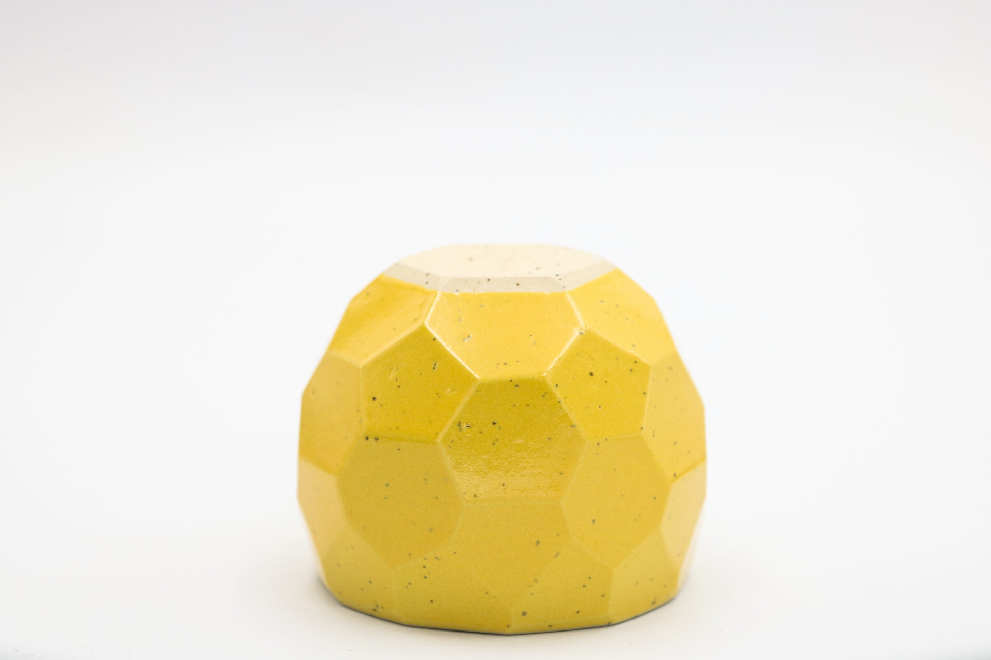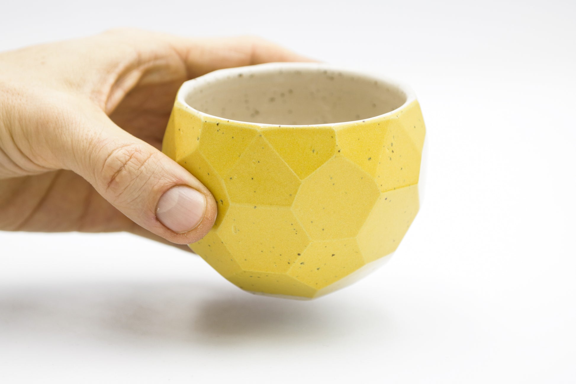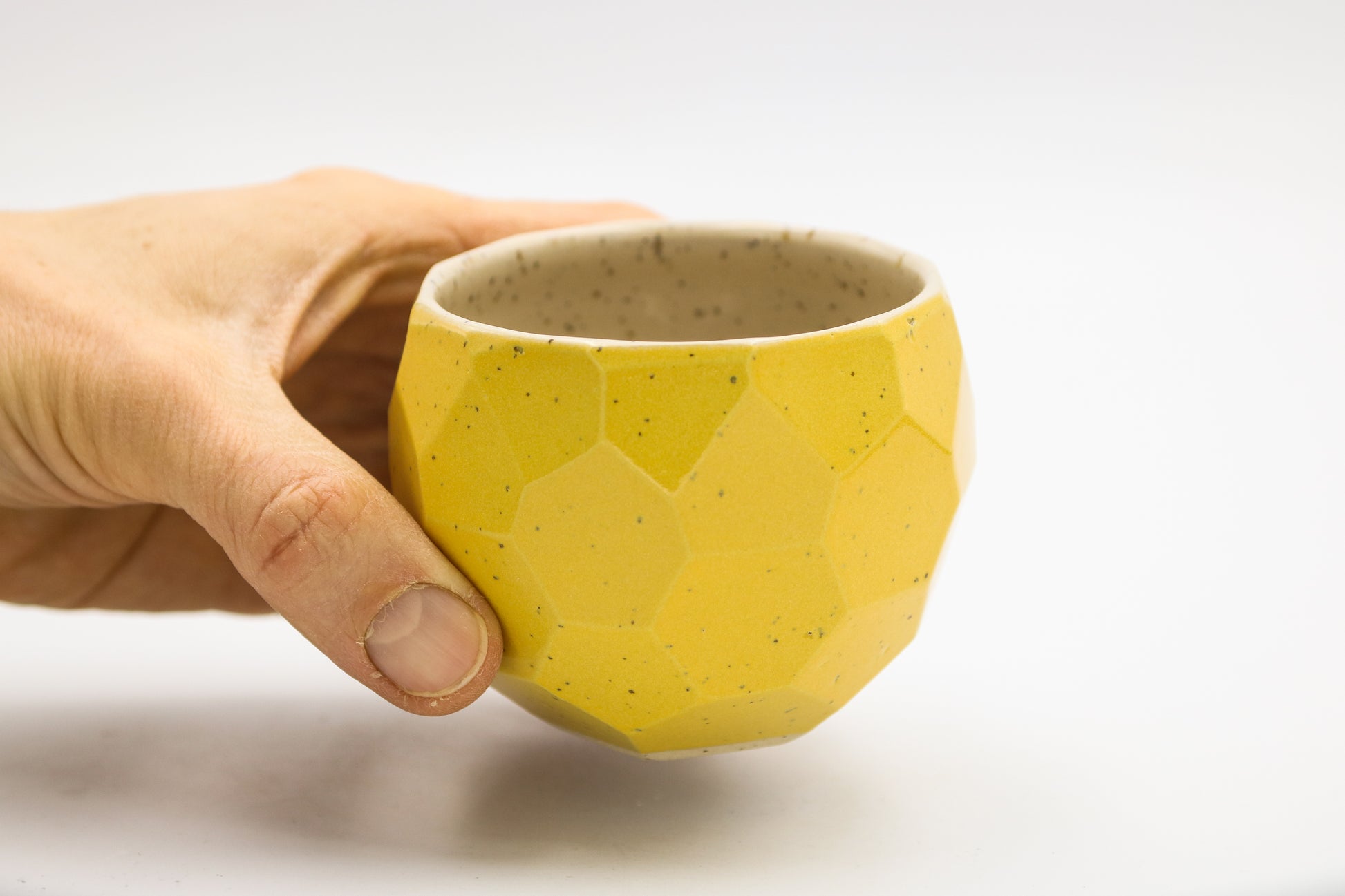 Hand thrown and cut, faceted stoneware cup. Glazed inside and outside. Each piece may be slightly different due to the handmade process.