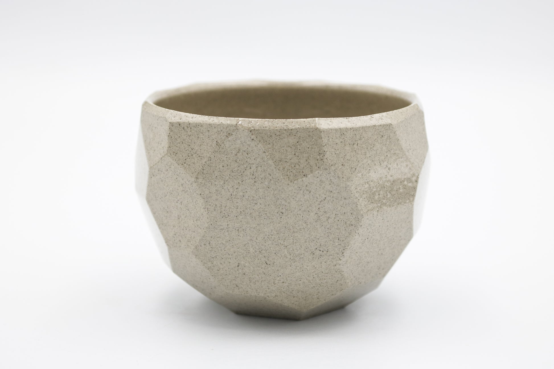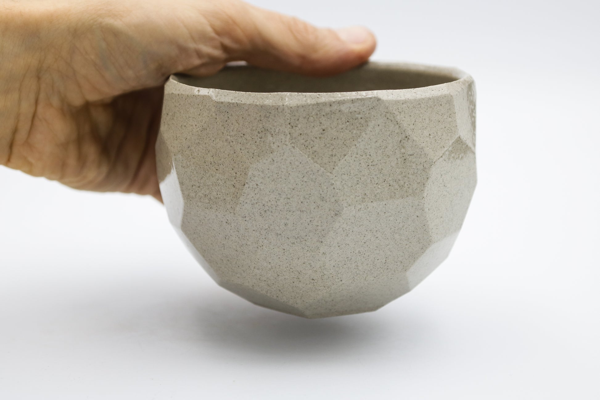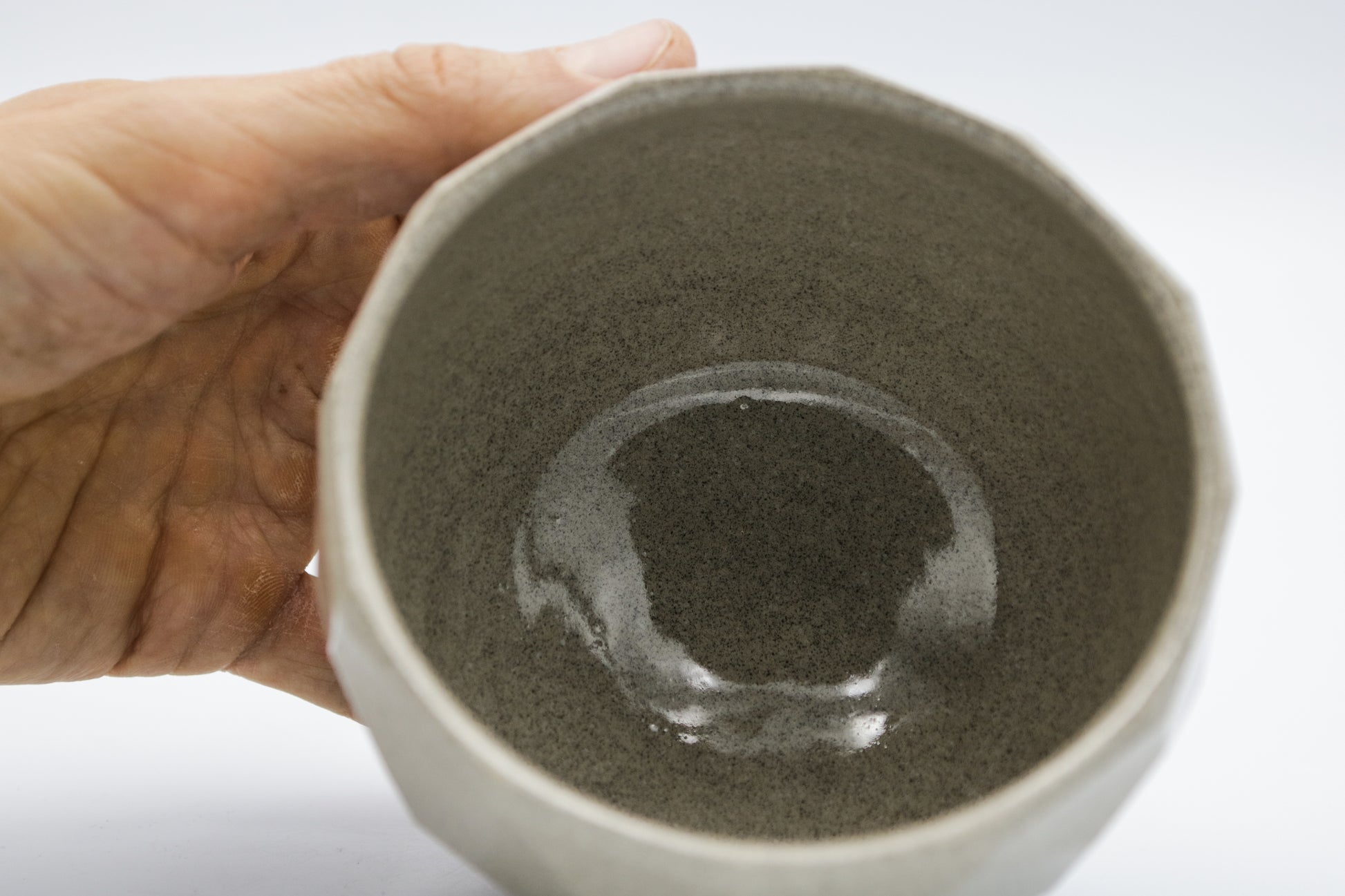 Hand thrown and cut, faceted stoneware bowl/chawan. Glazed inside and outside with transparent glaze on light grey stoneware. Ideal shape and size for matcha. One of a kind.