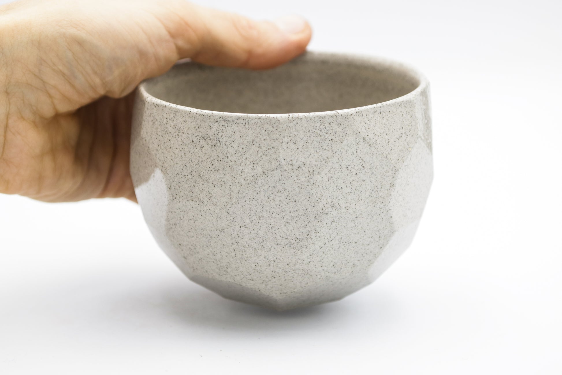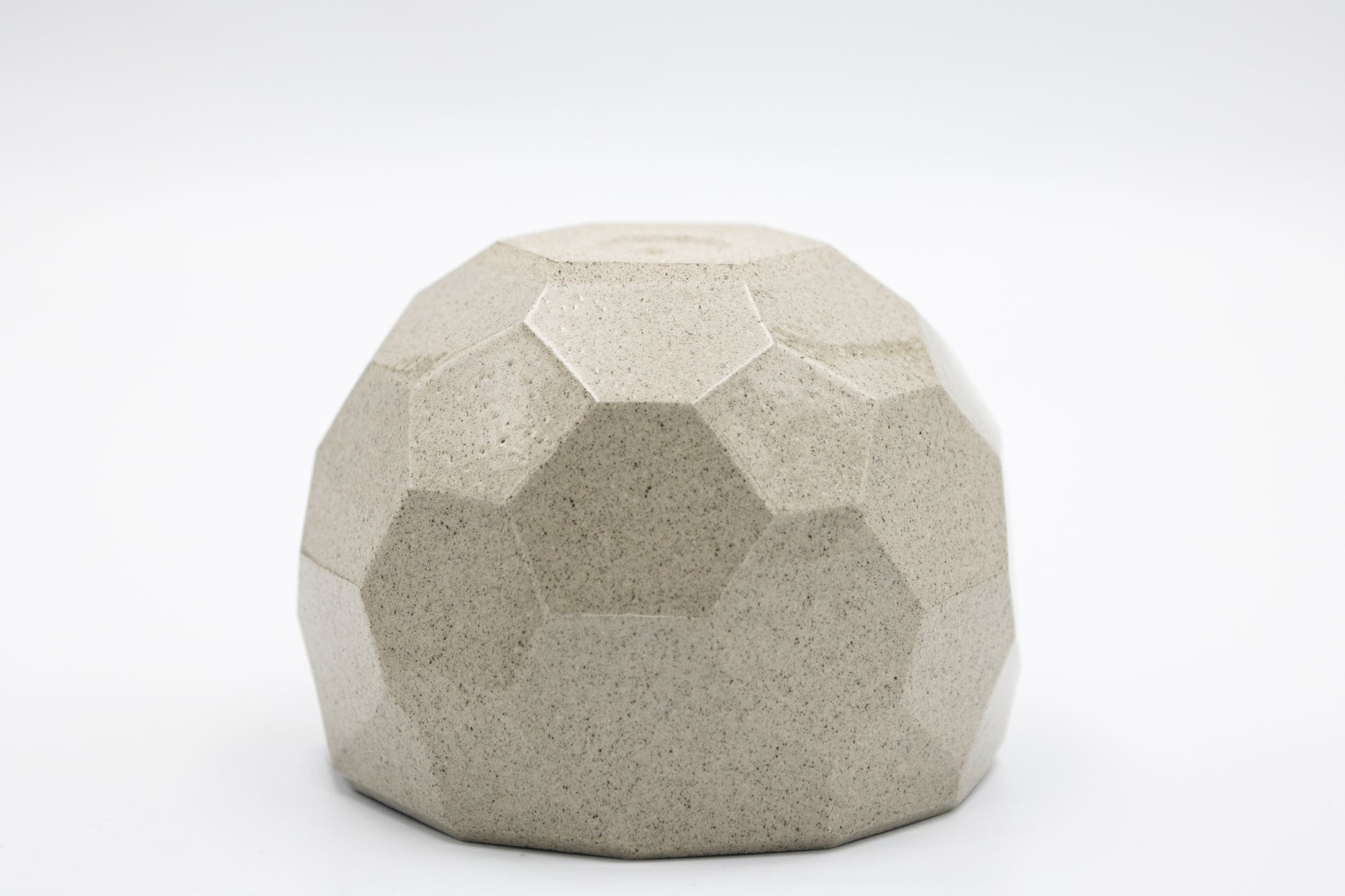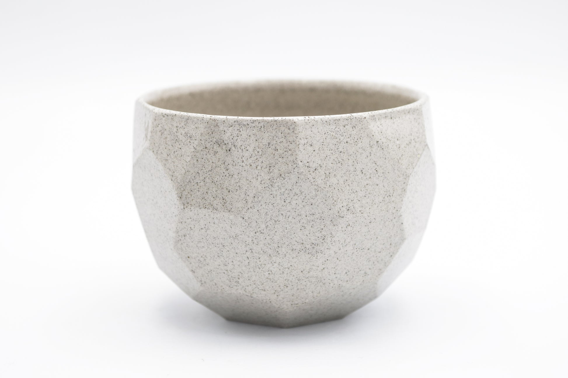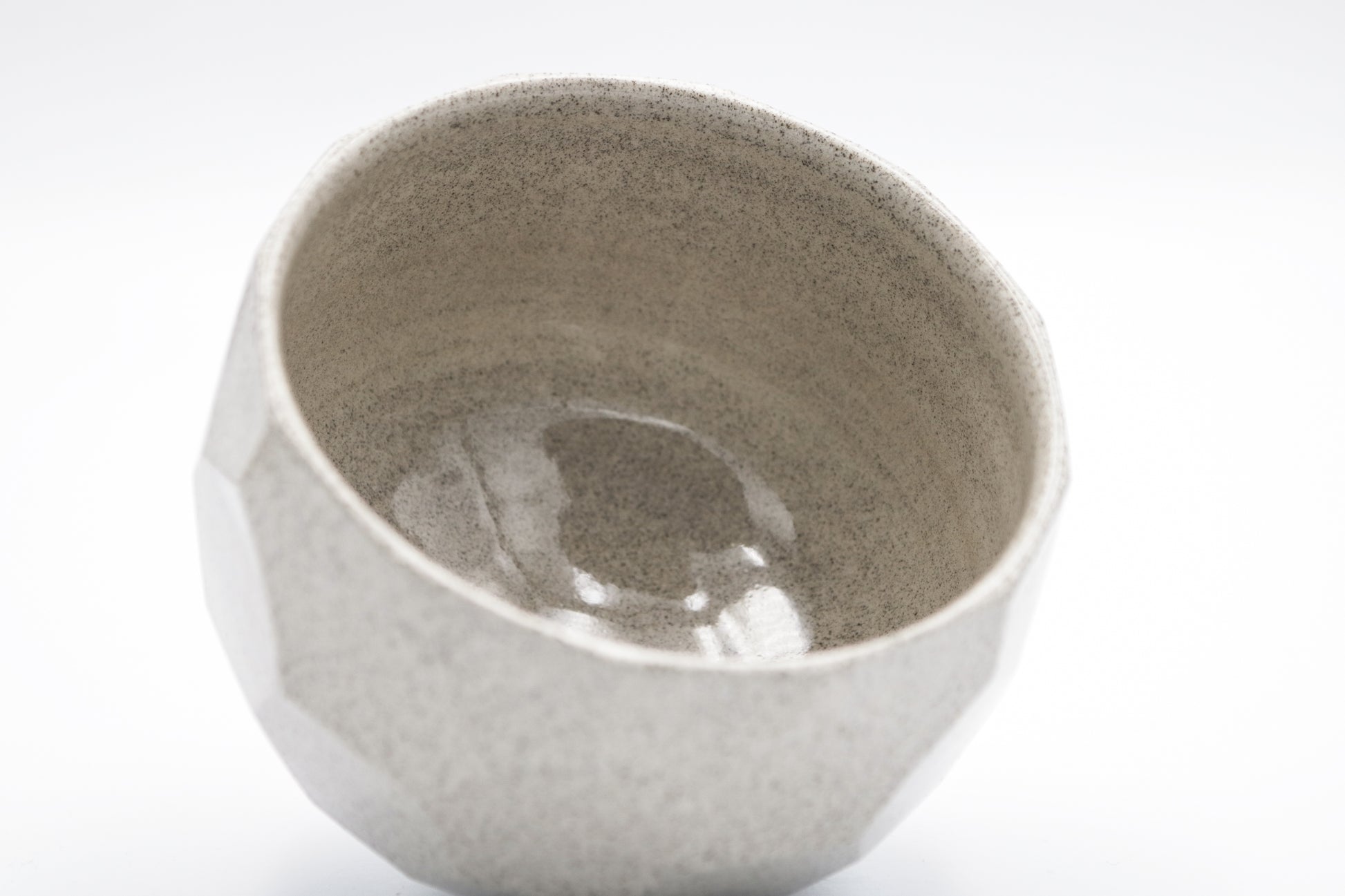 Hand thrown and cut, faceted stoneware bowl/chawan. Glazed inside and outside with transparent glaze on light grey stoneware. Ideal shape and size for matcha. One of a kind.
