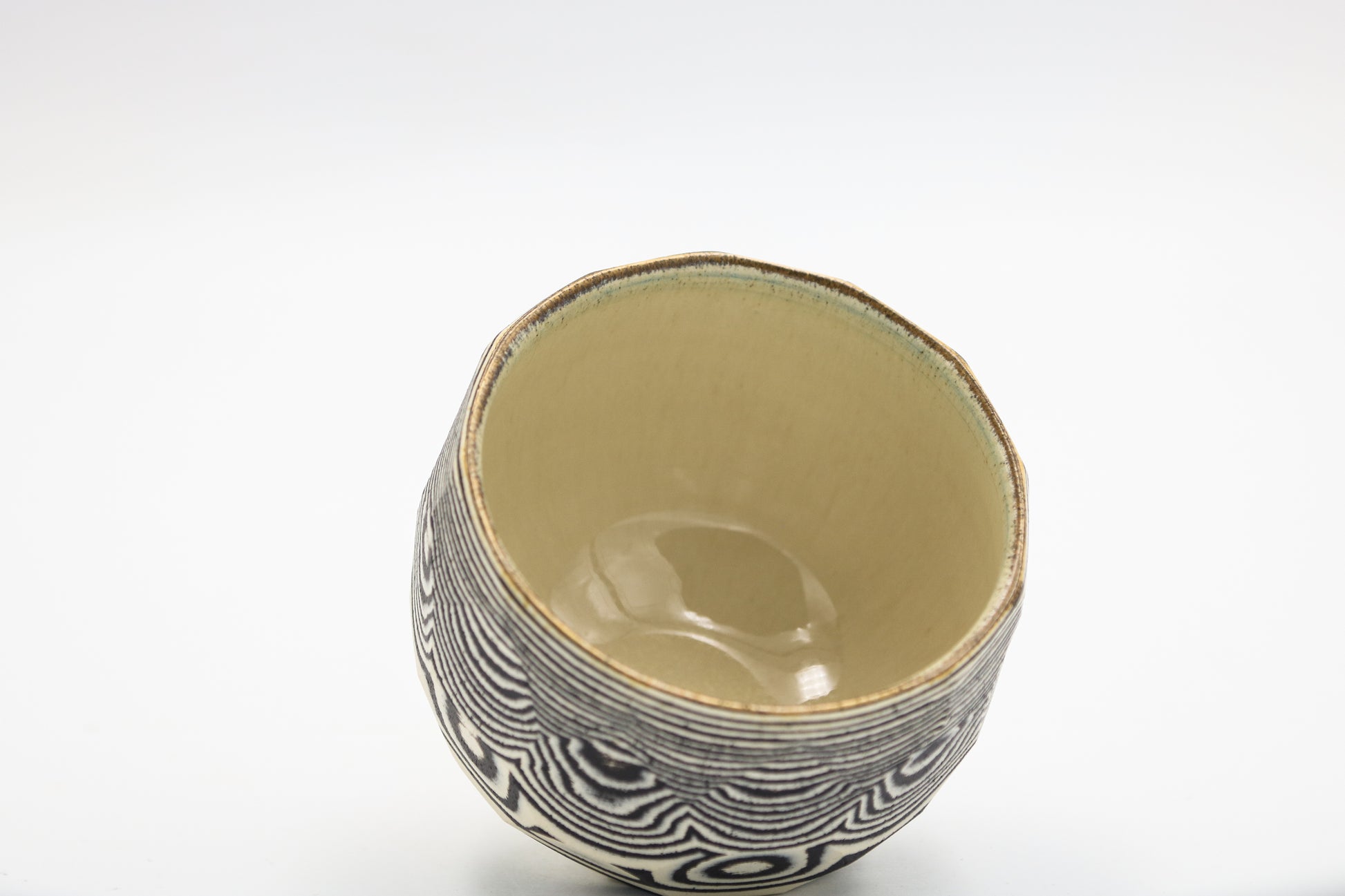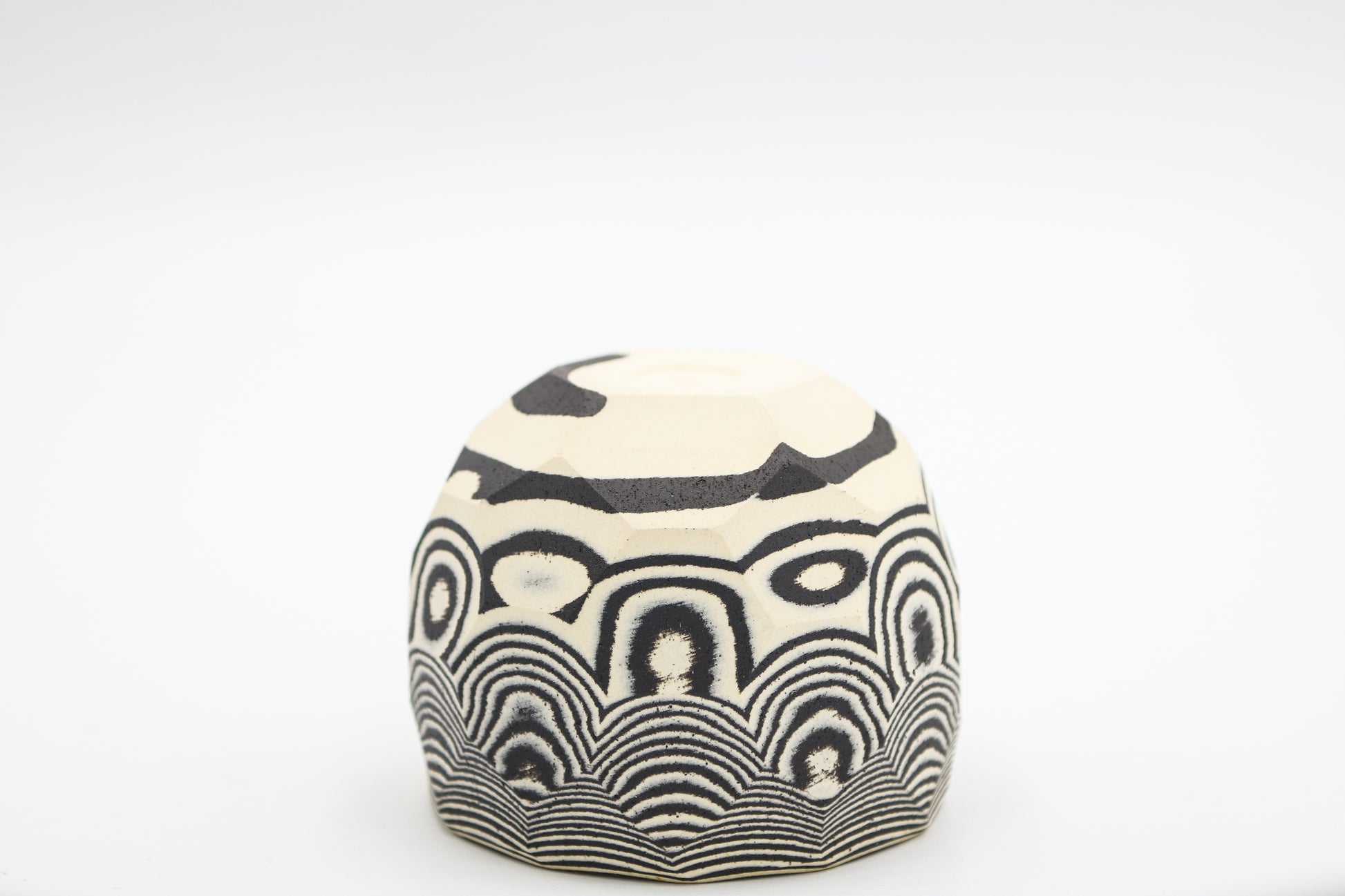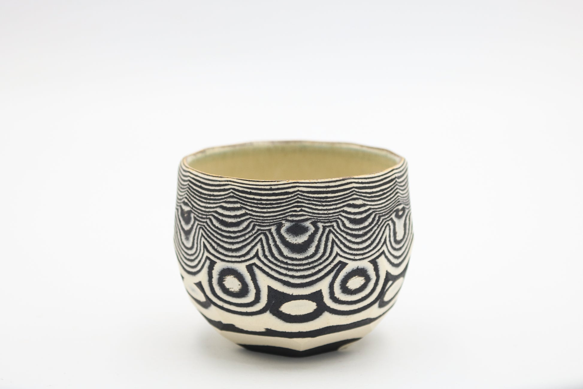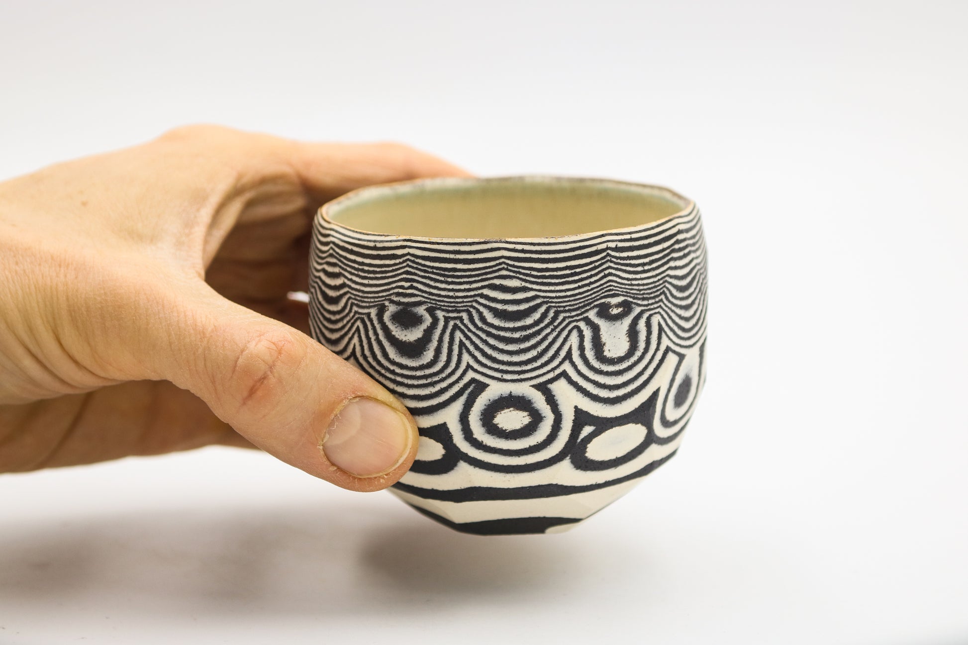 Hand thrown and cut, black and white mixed stoneware cup. Glazed inside only.