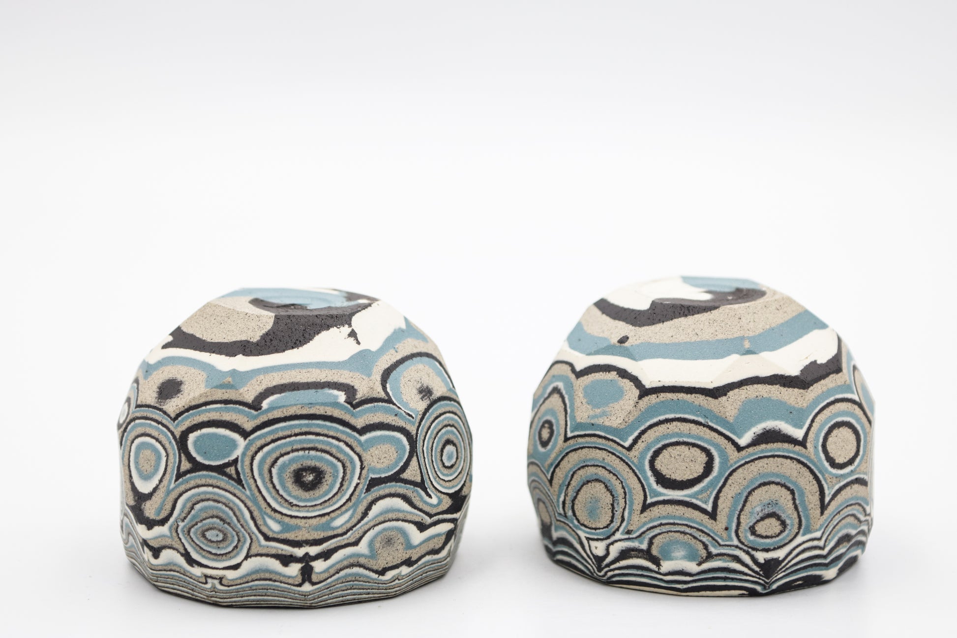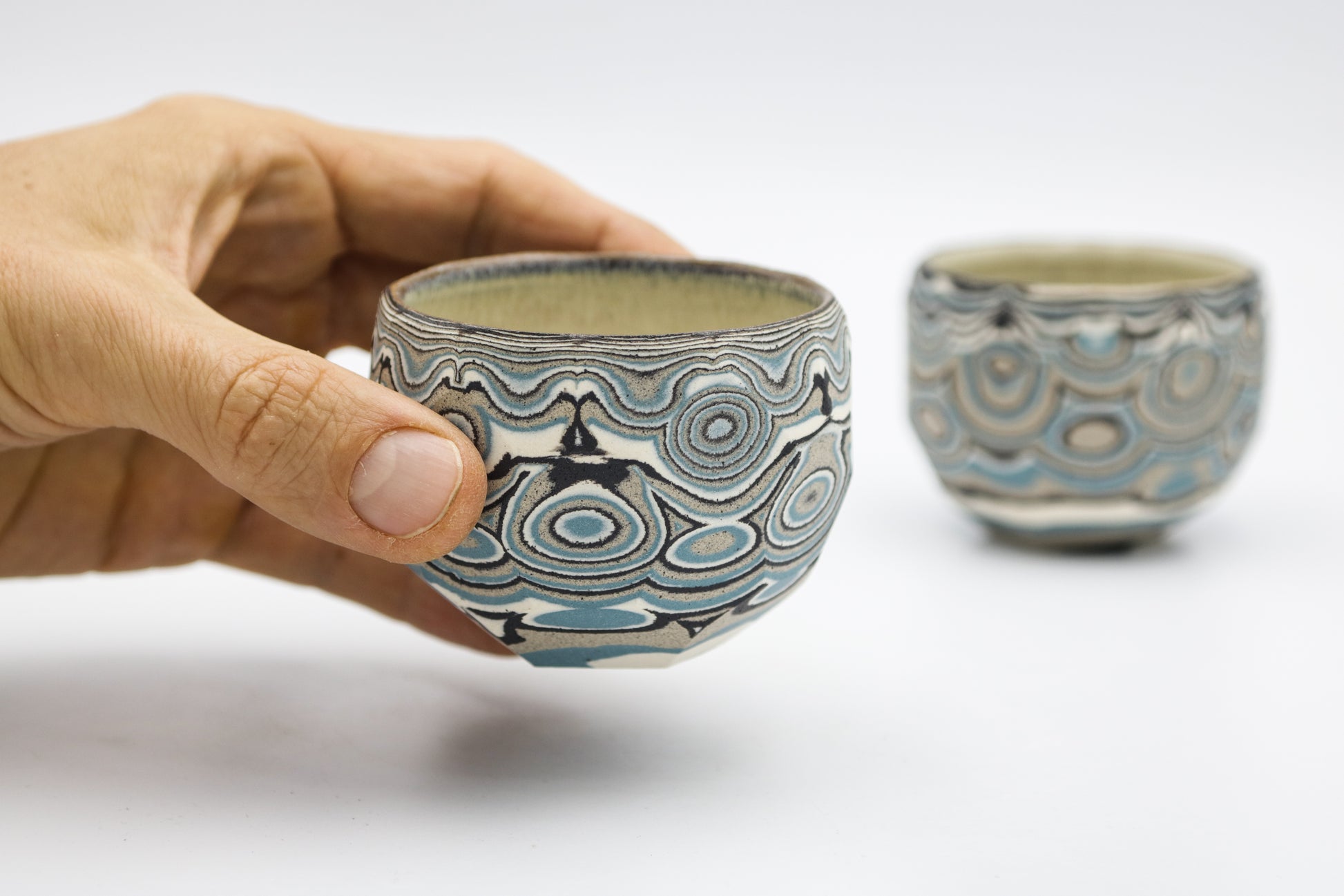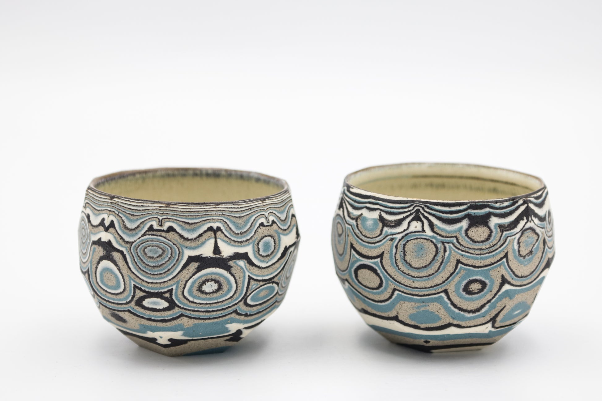 Hand thrown and cut, black, white, gray and blue mixed stoneware cup set of two.