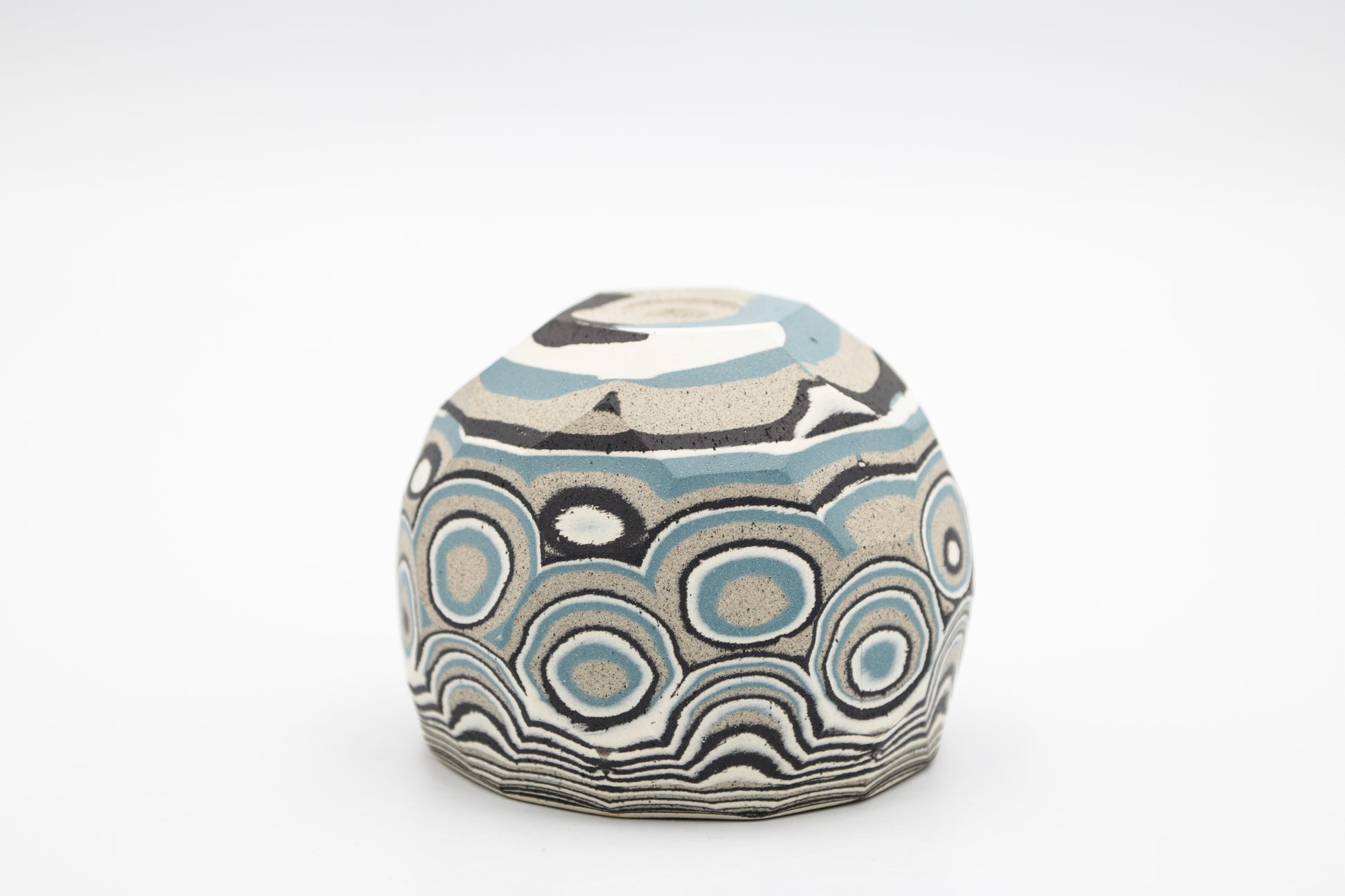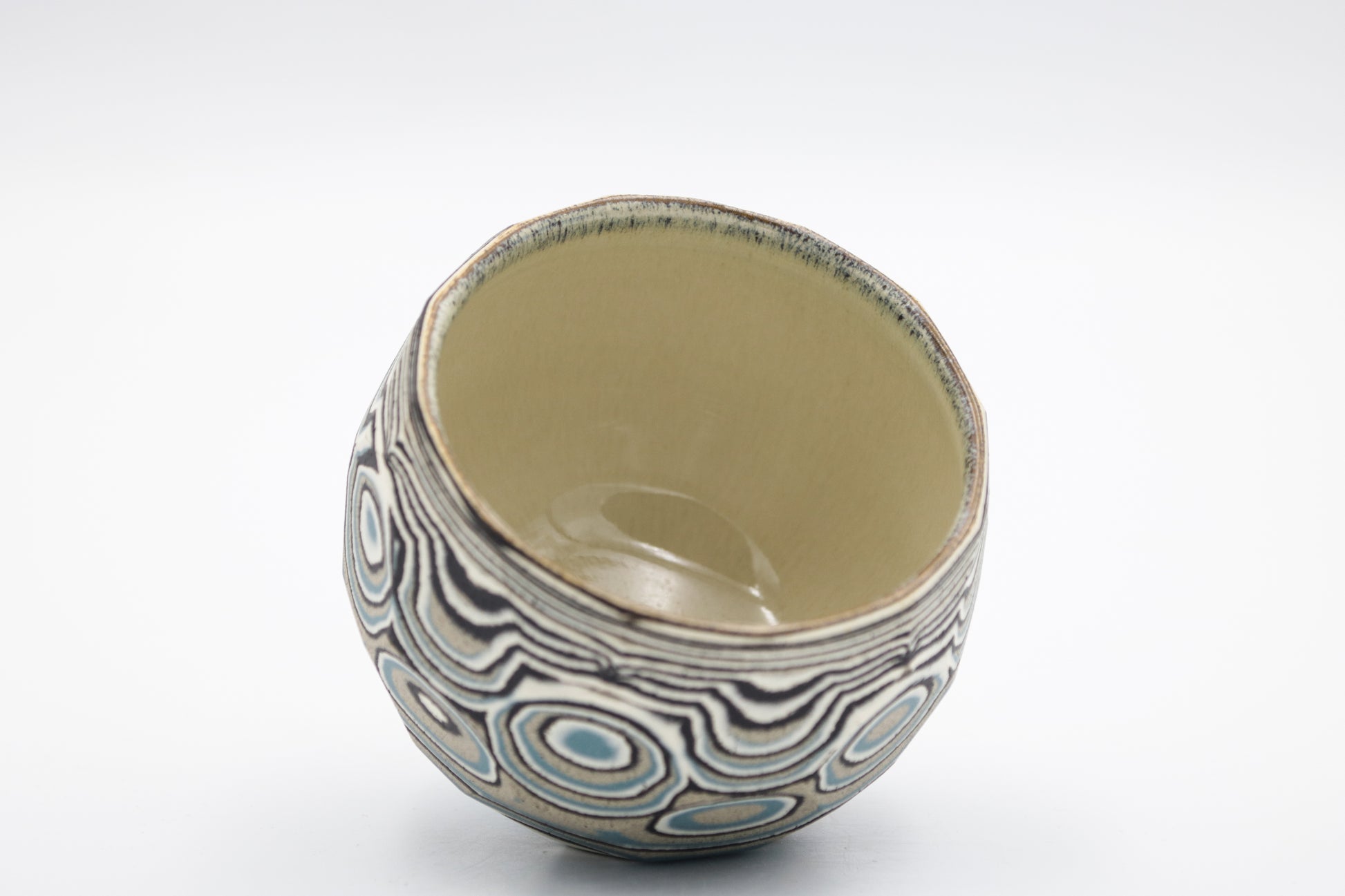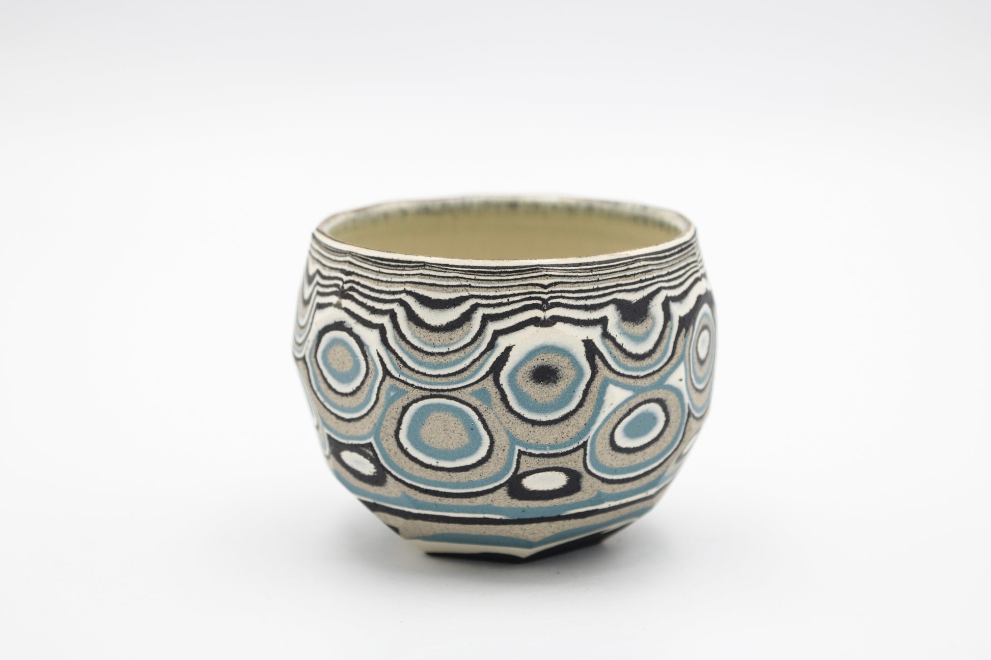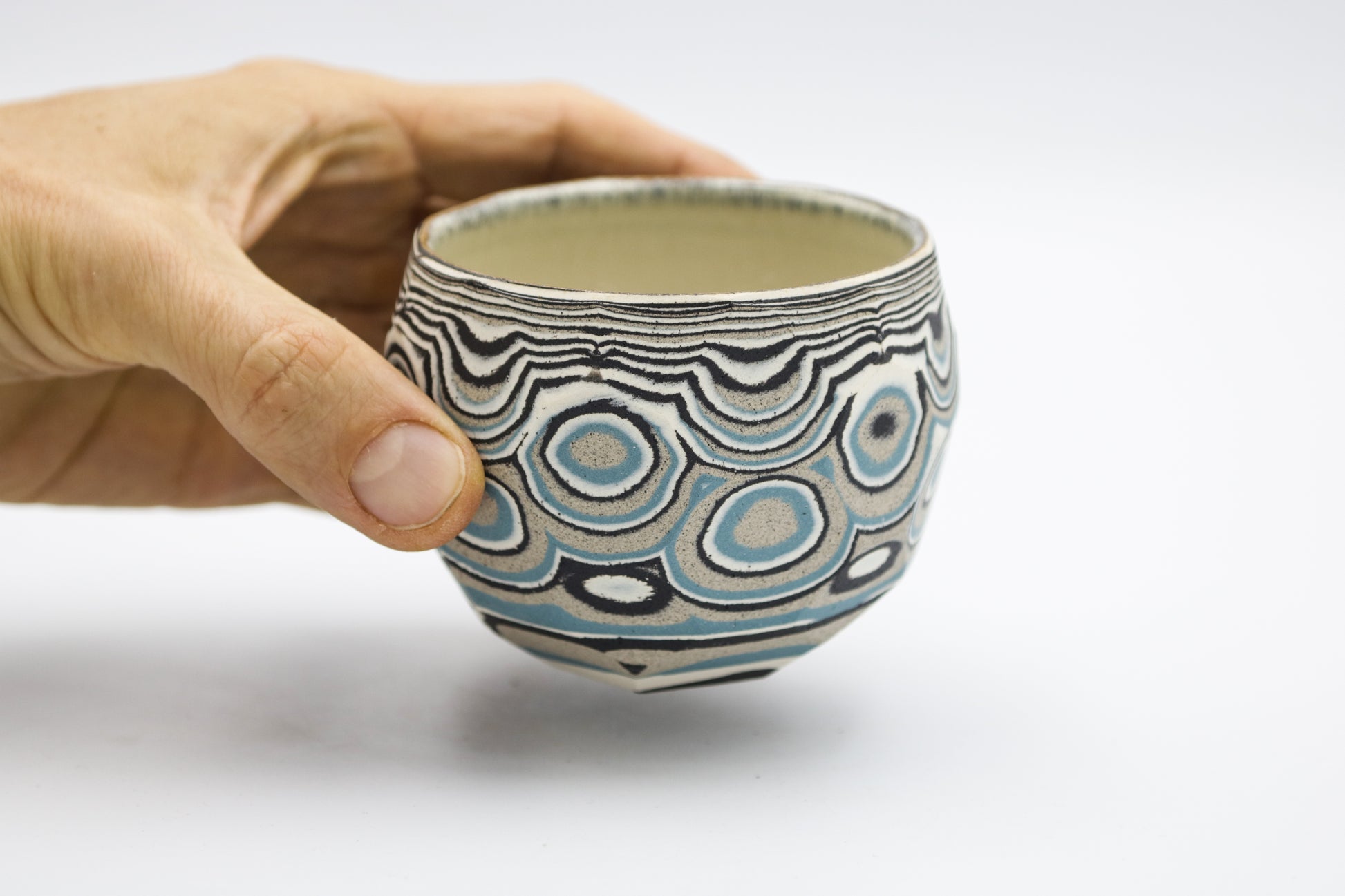 Hand thrown and cut, black, white, gray and blue mixed stoneware cup.