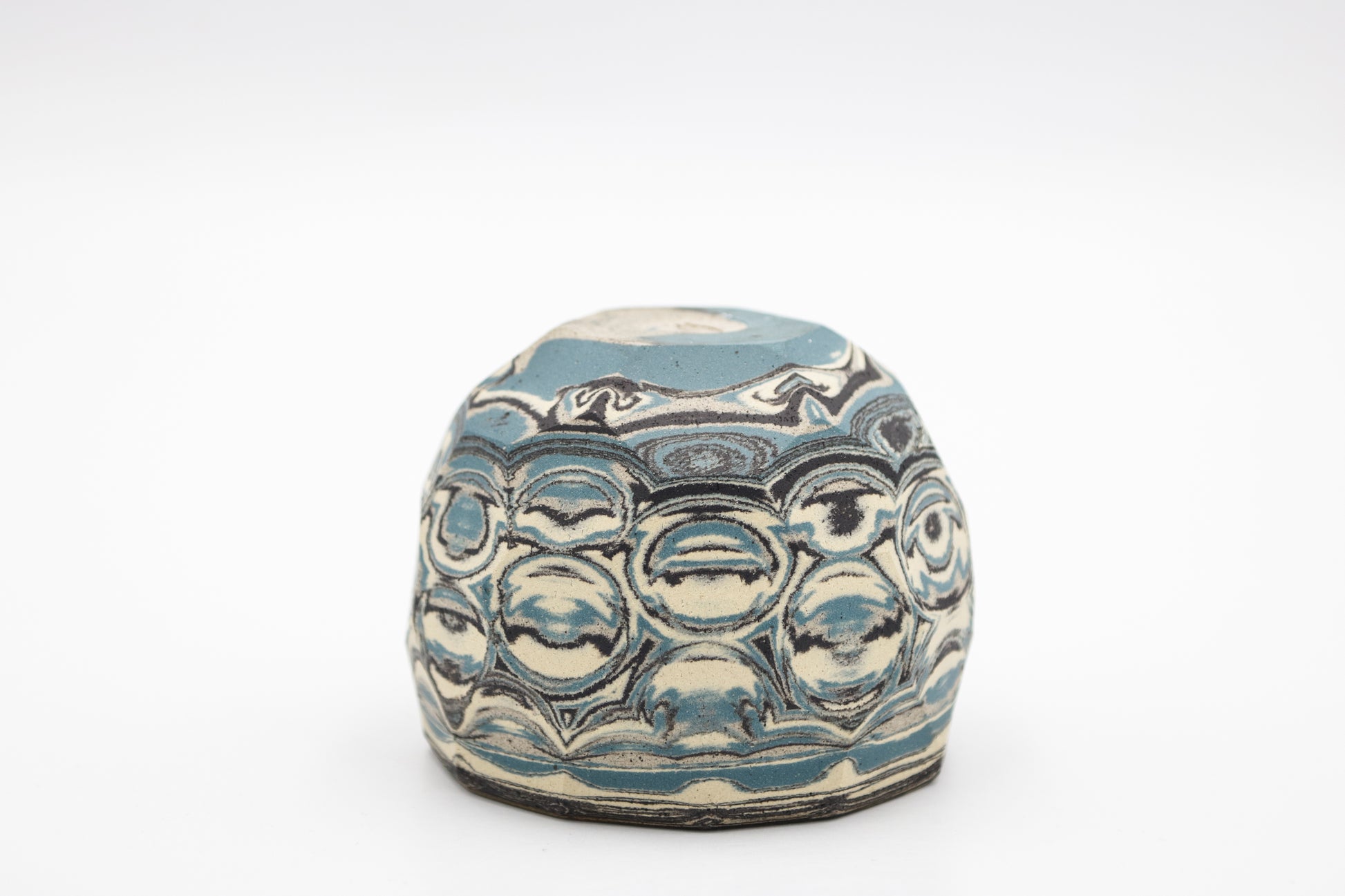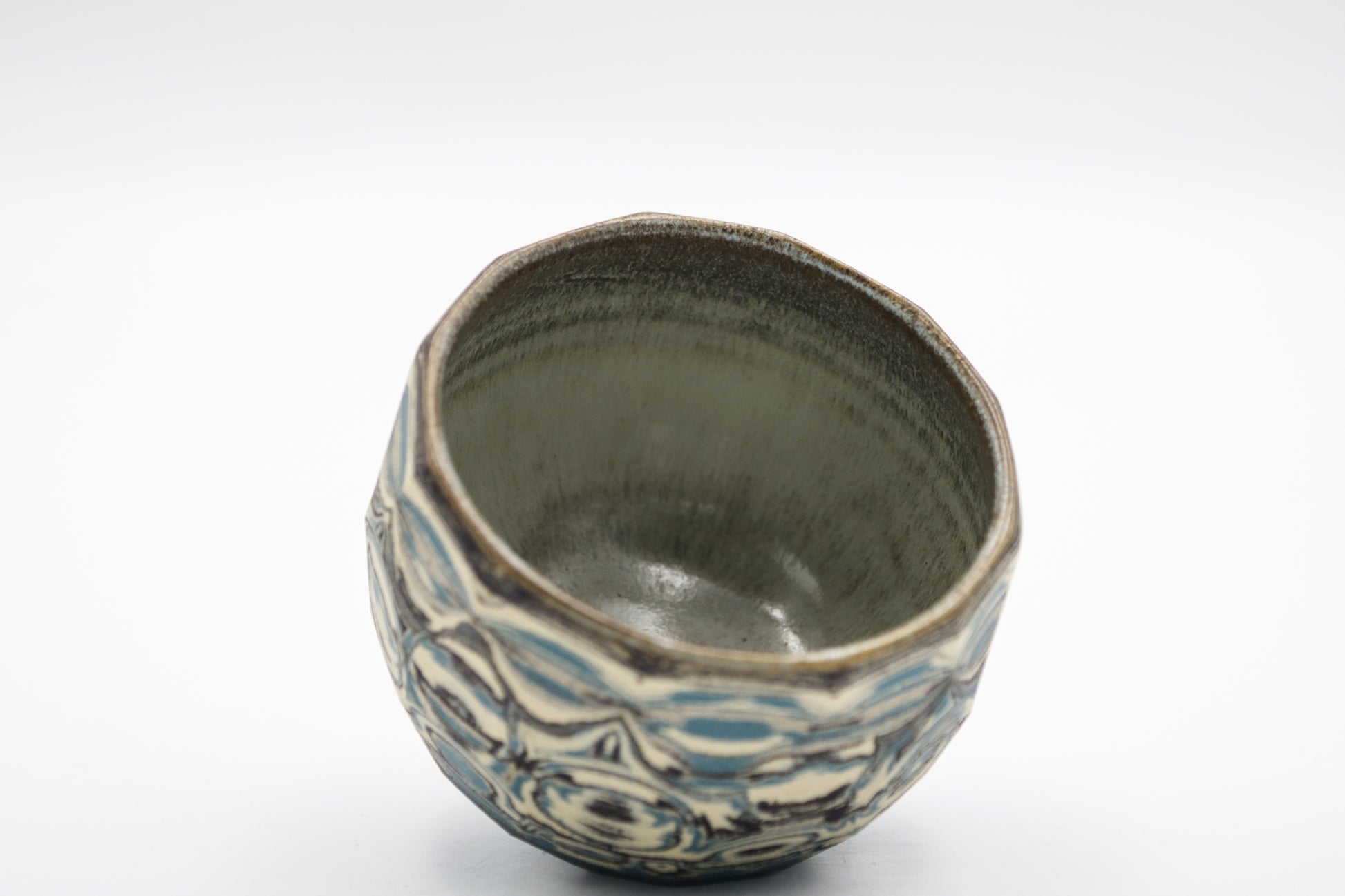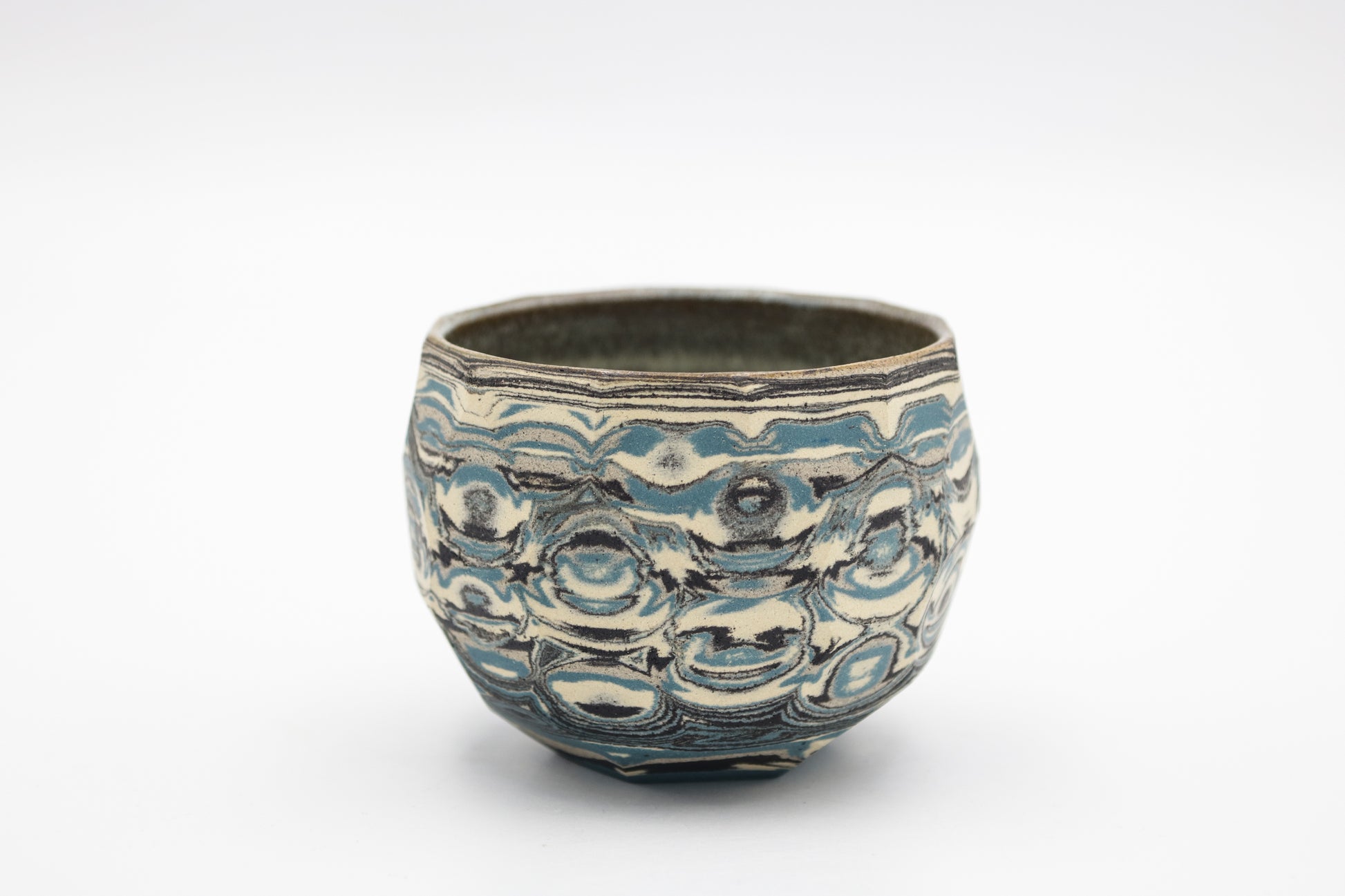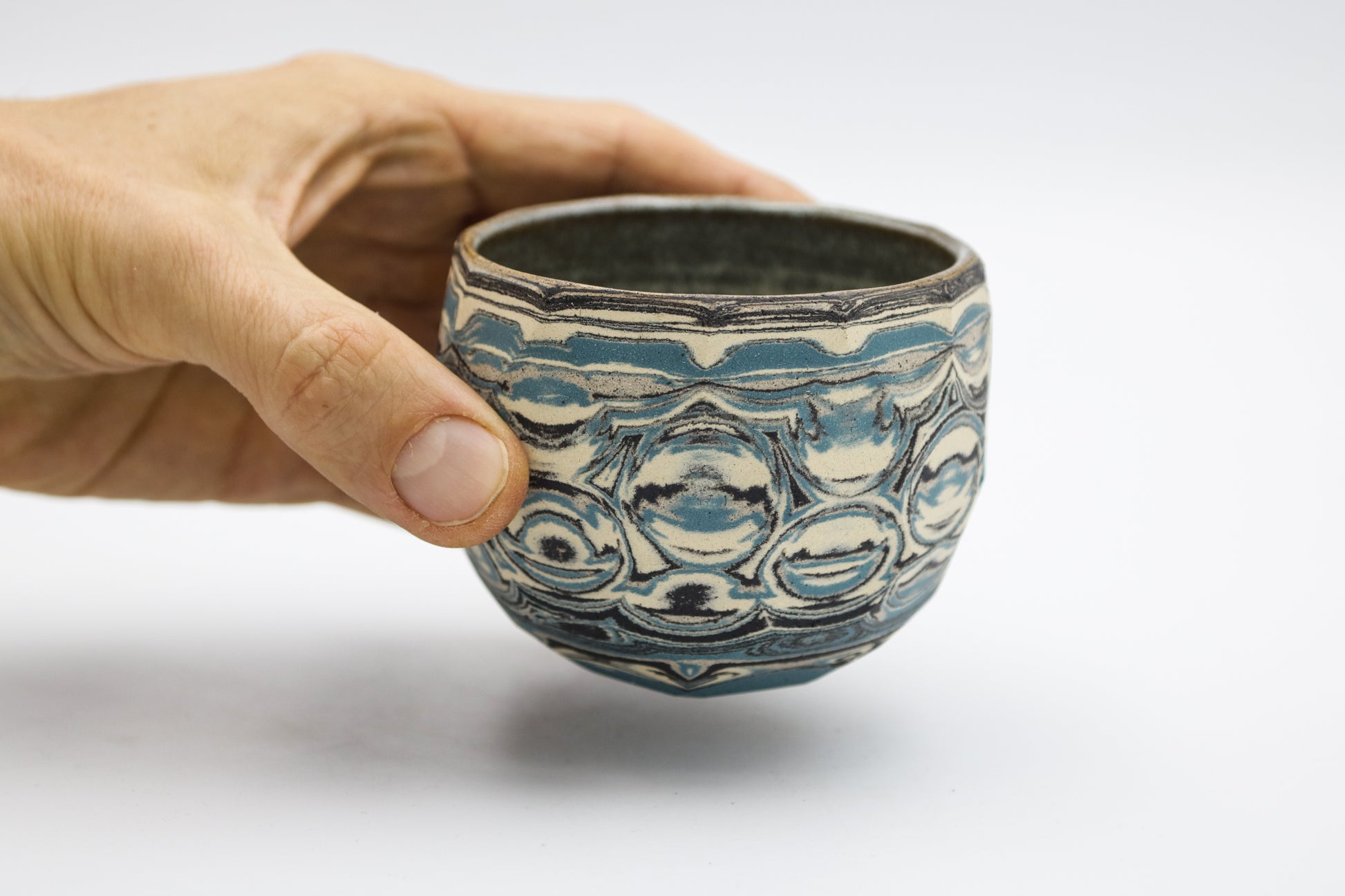 Hand thrown and cut, black, beige, gray and blue mixed stoneware cup.