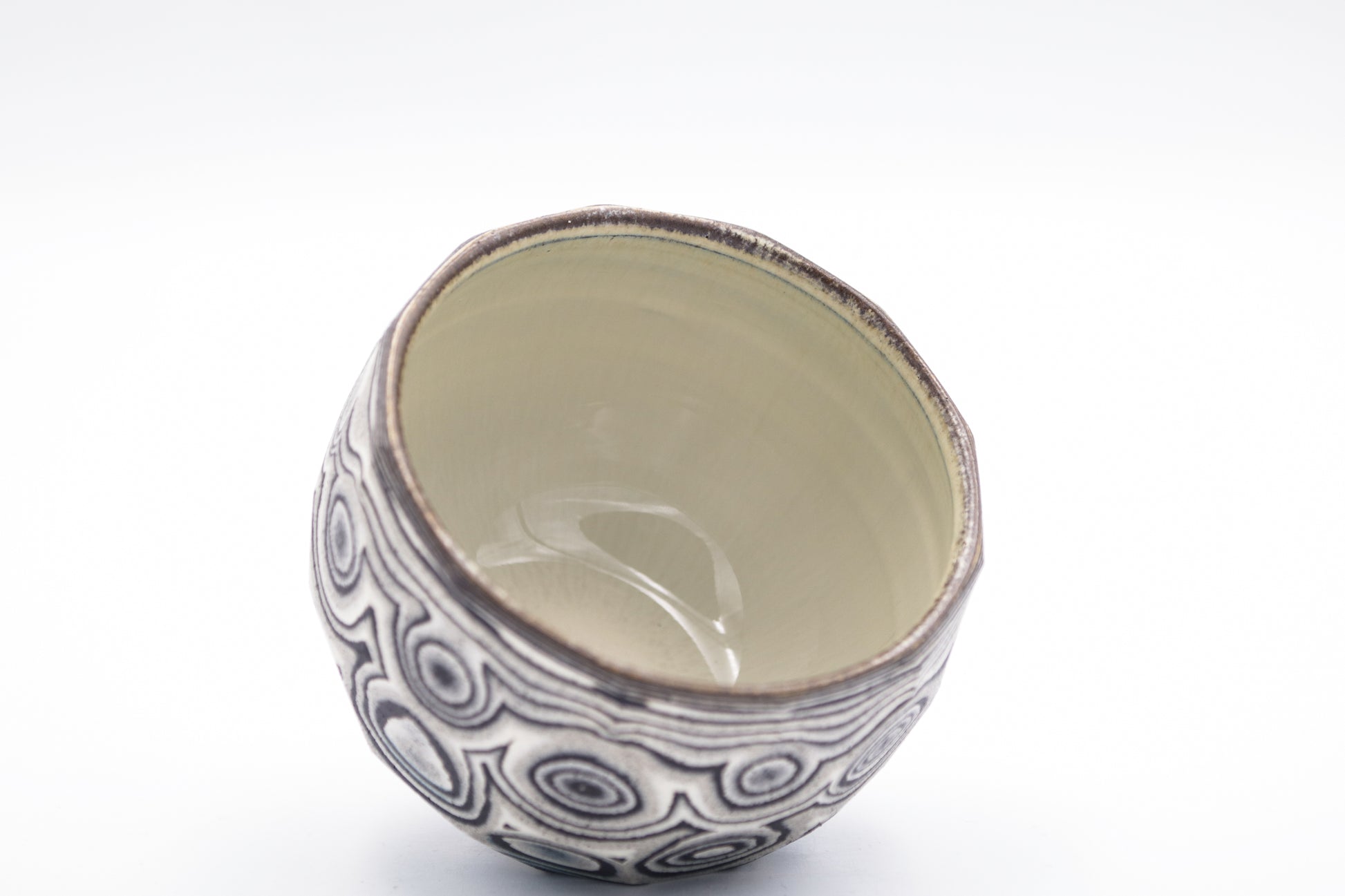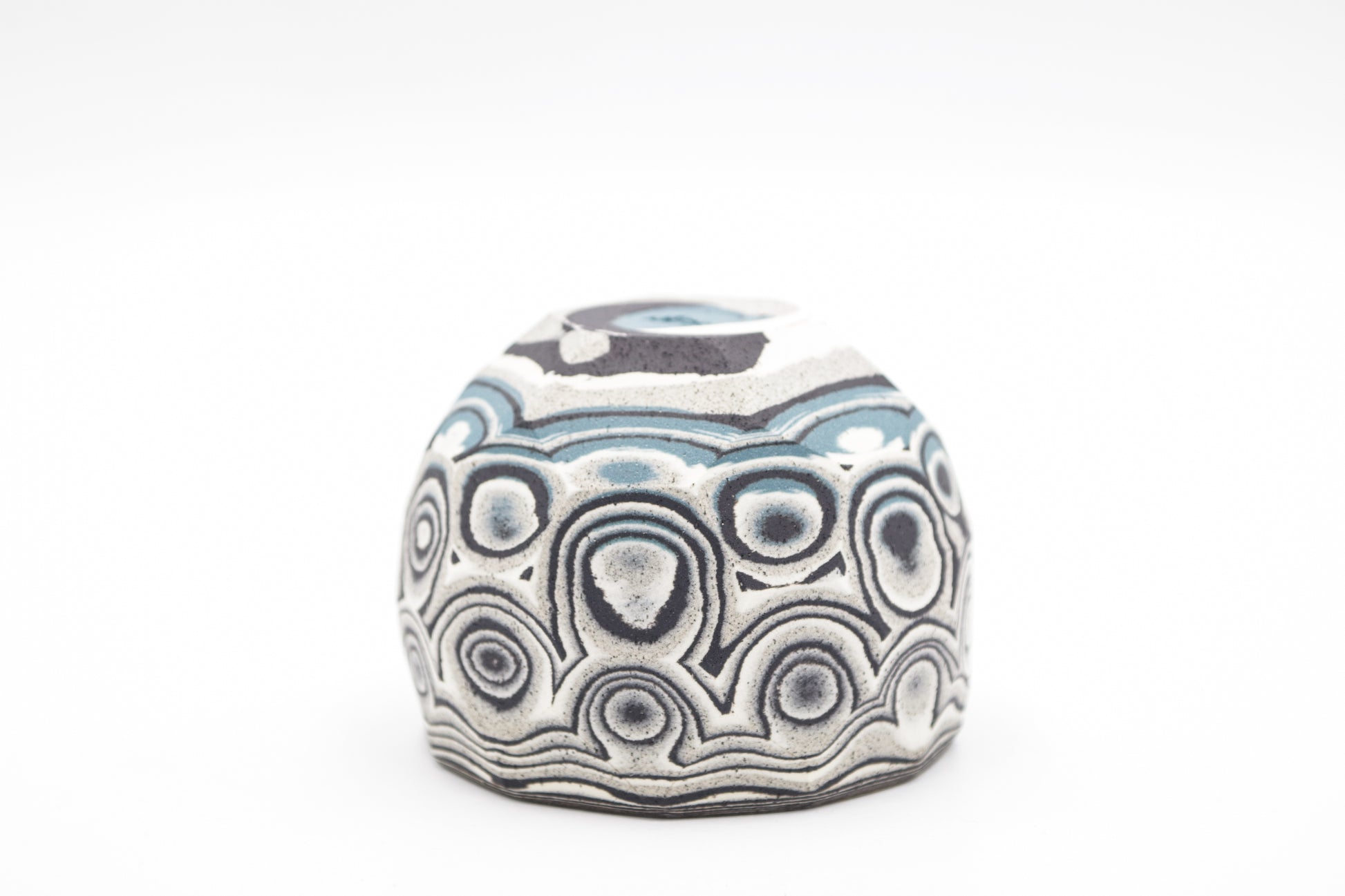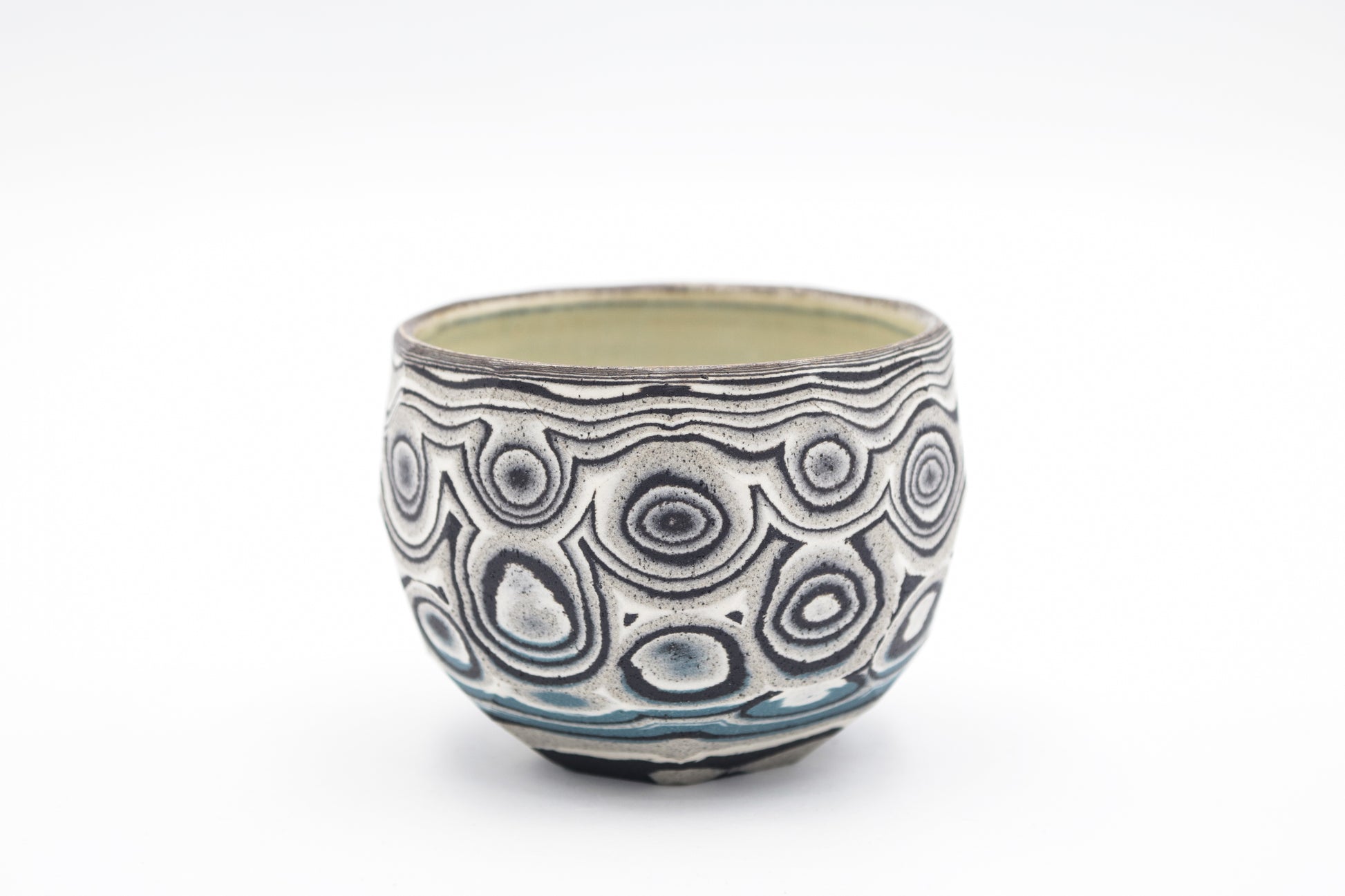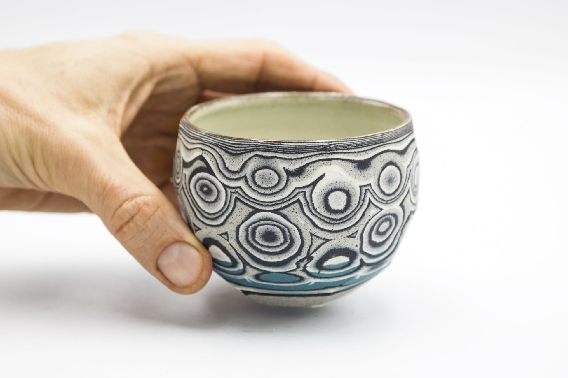 Hand thrown and cut, black, white, gray and blue mixed stoneware cup.
