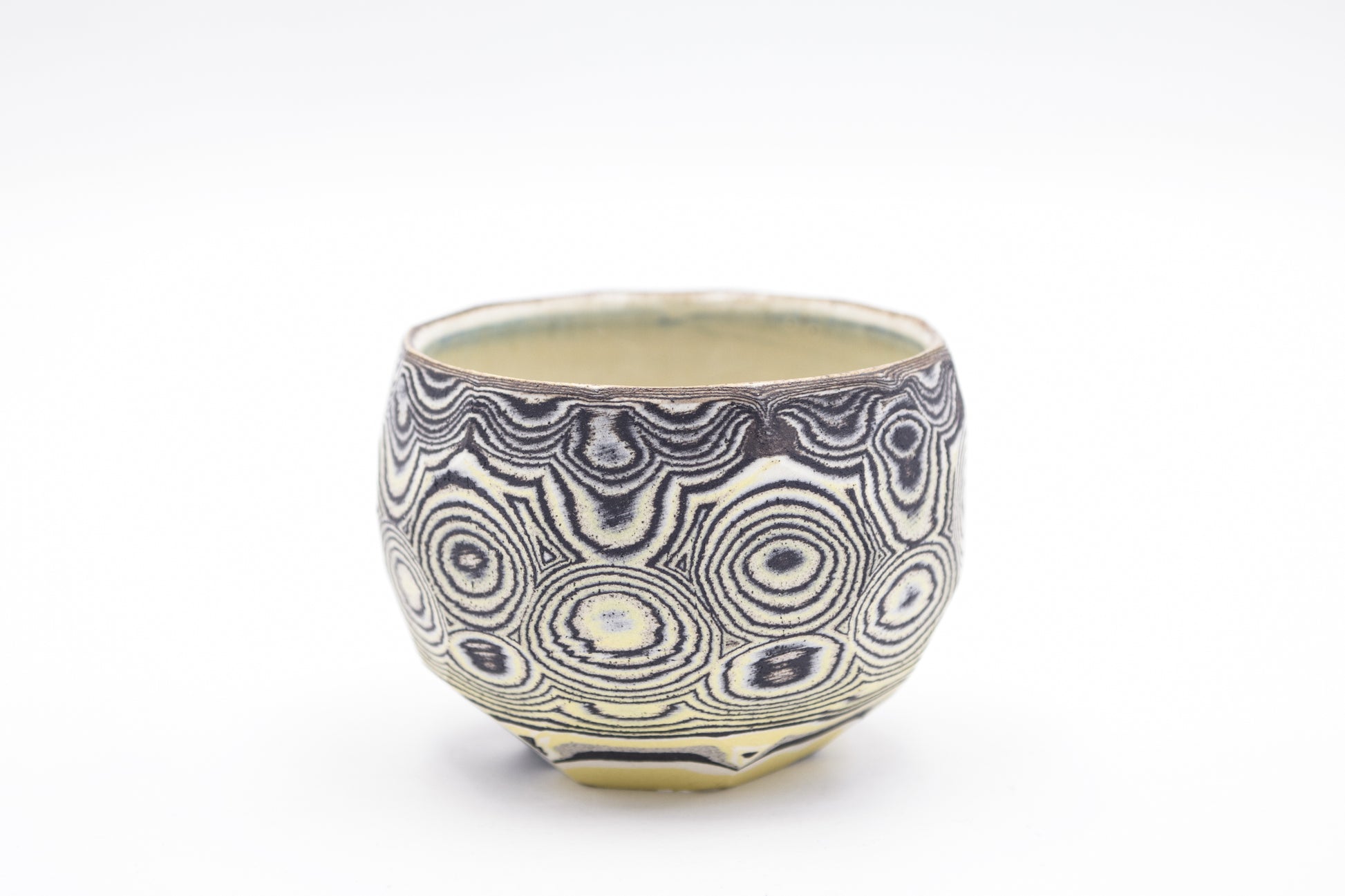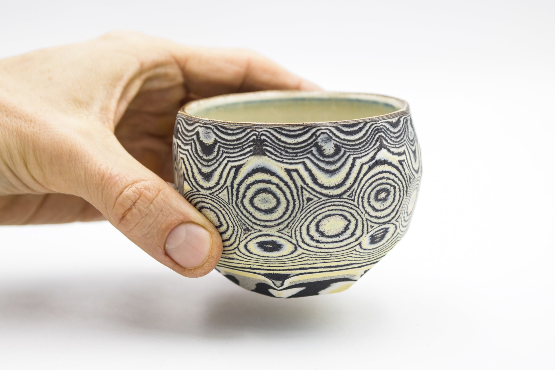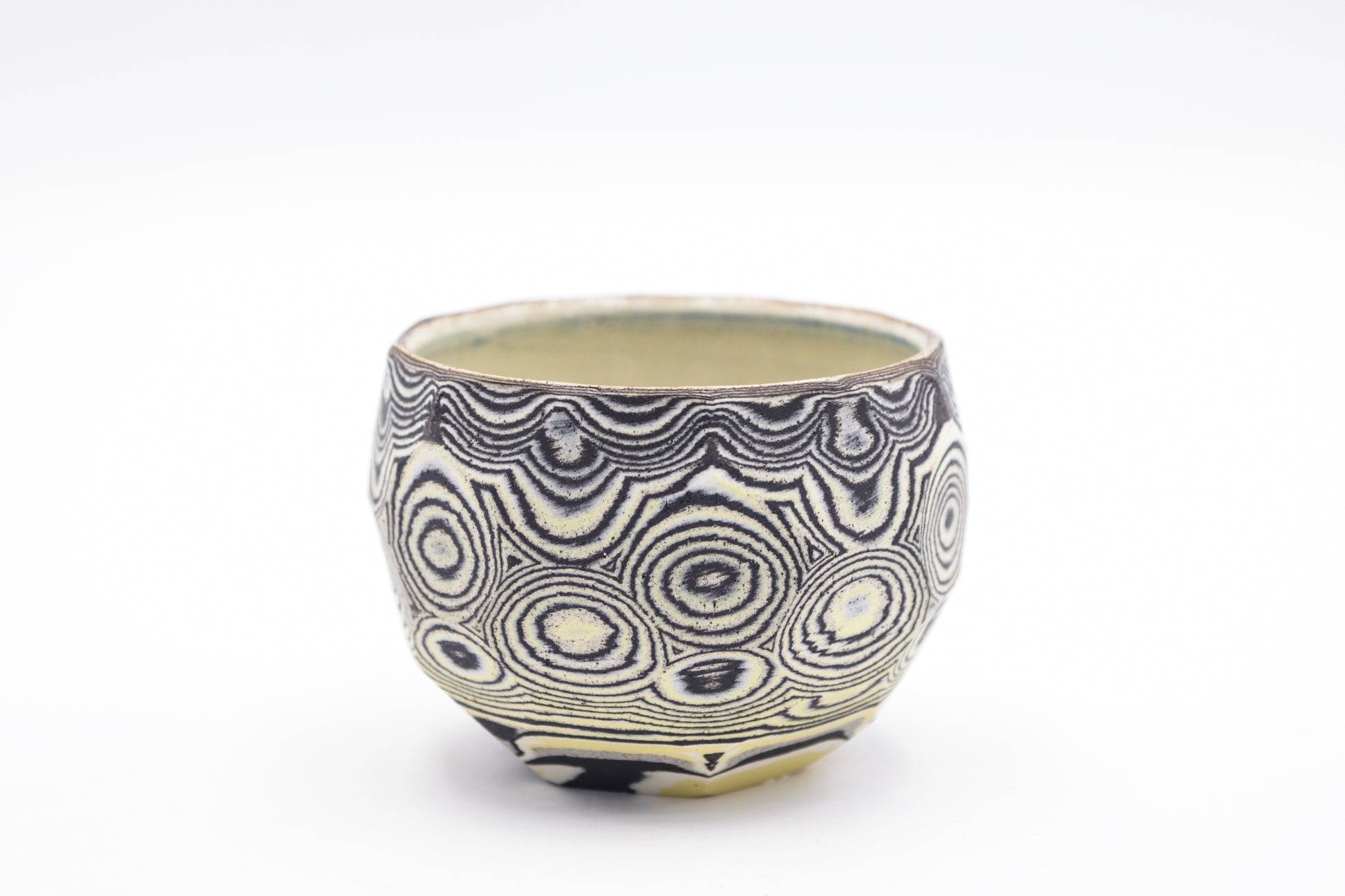 Hand thrown and cut, black, white, grey and yellow mixed stoneware cup.