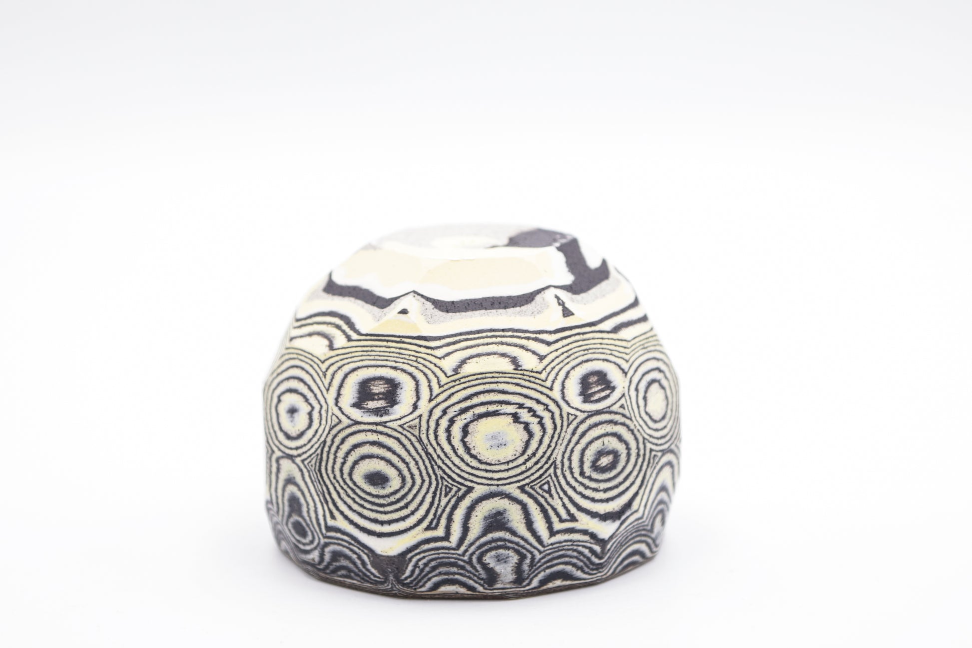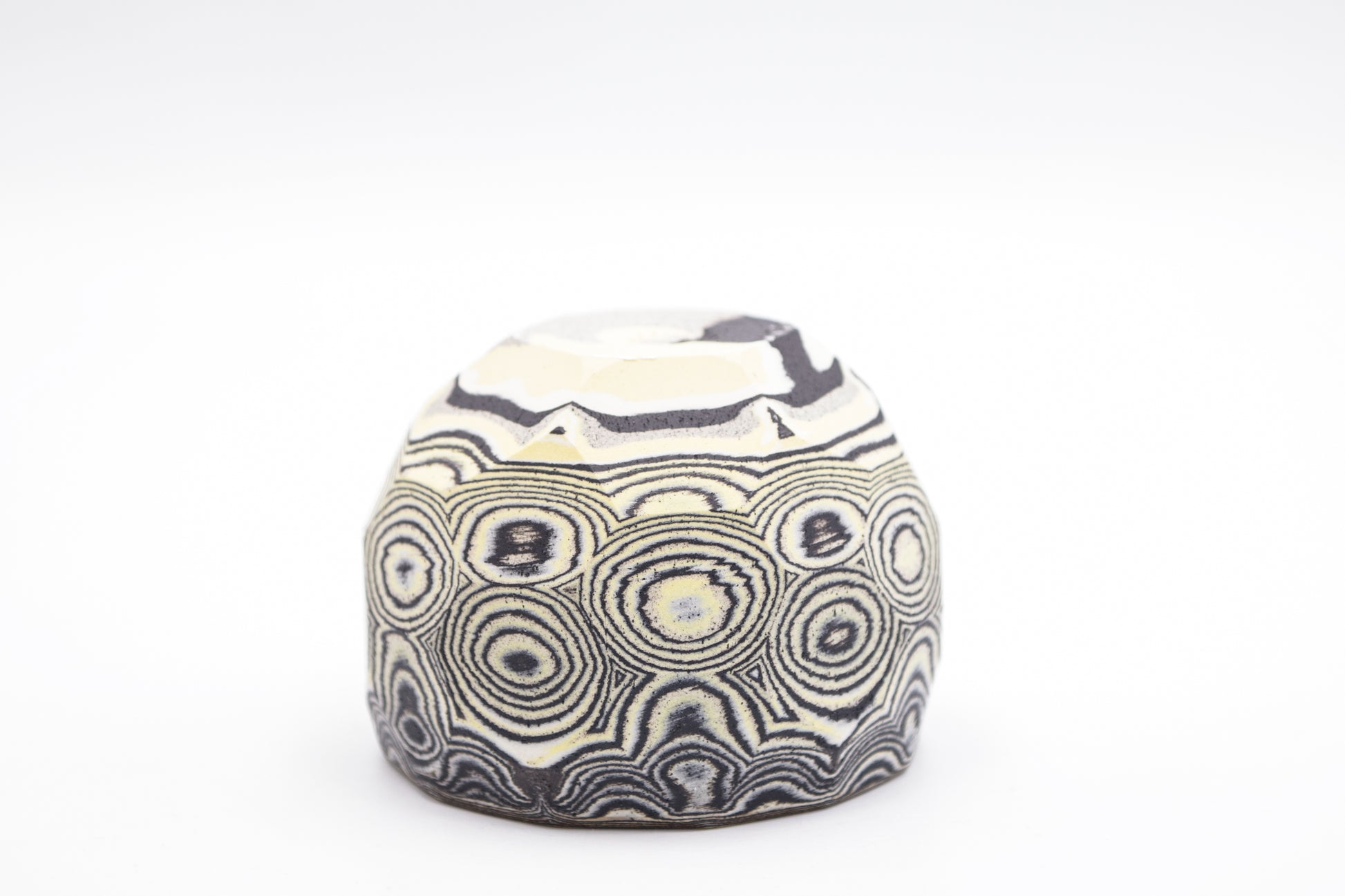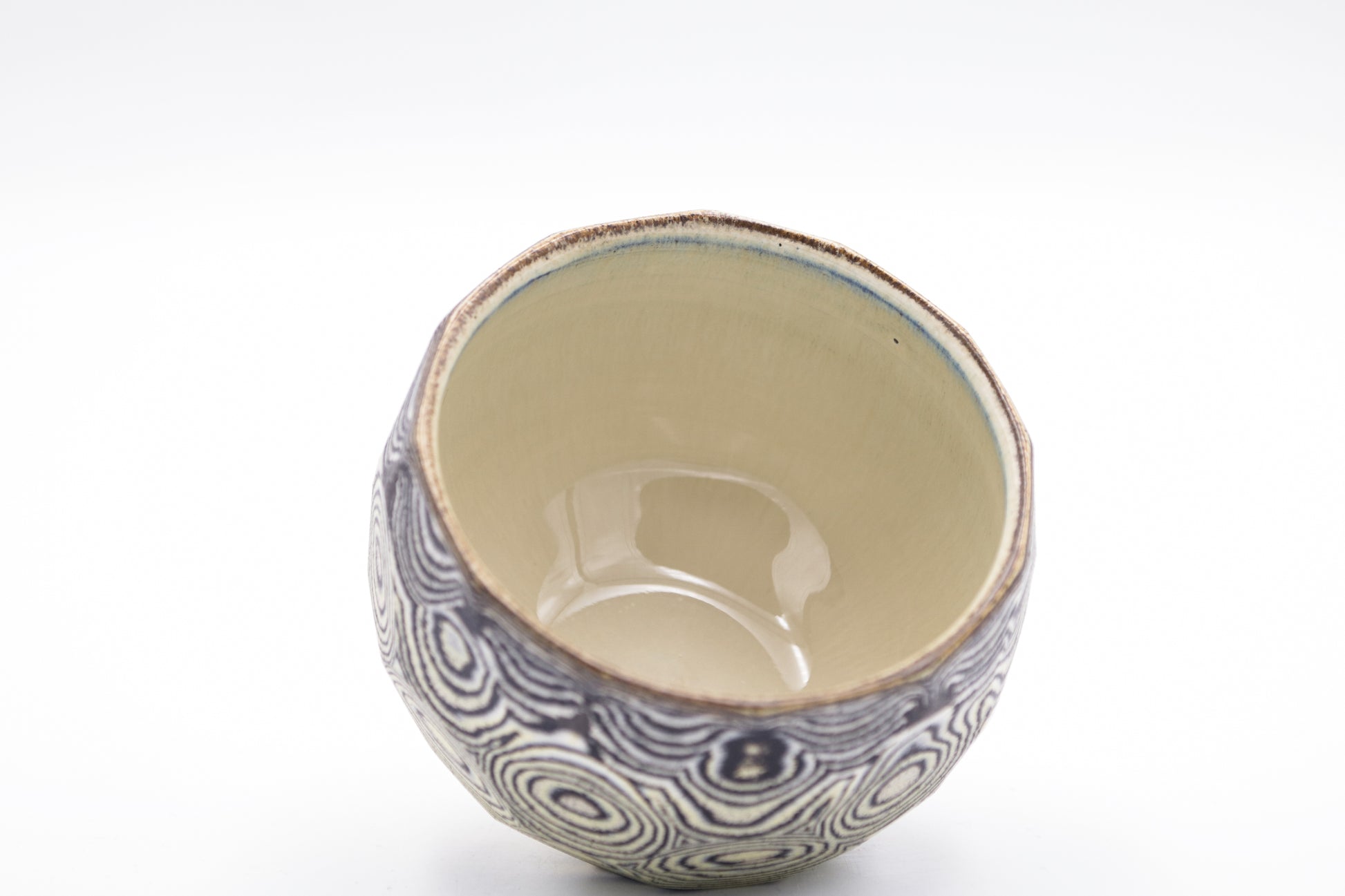 Hand thrown and cut, black, white, grey and yellow mixed stoneware cup.