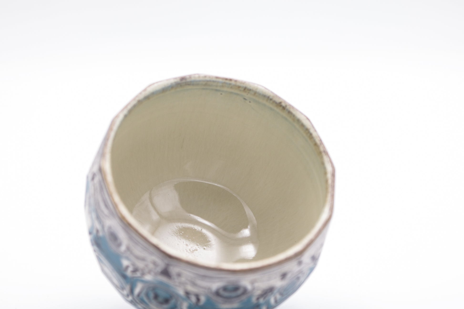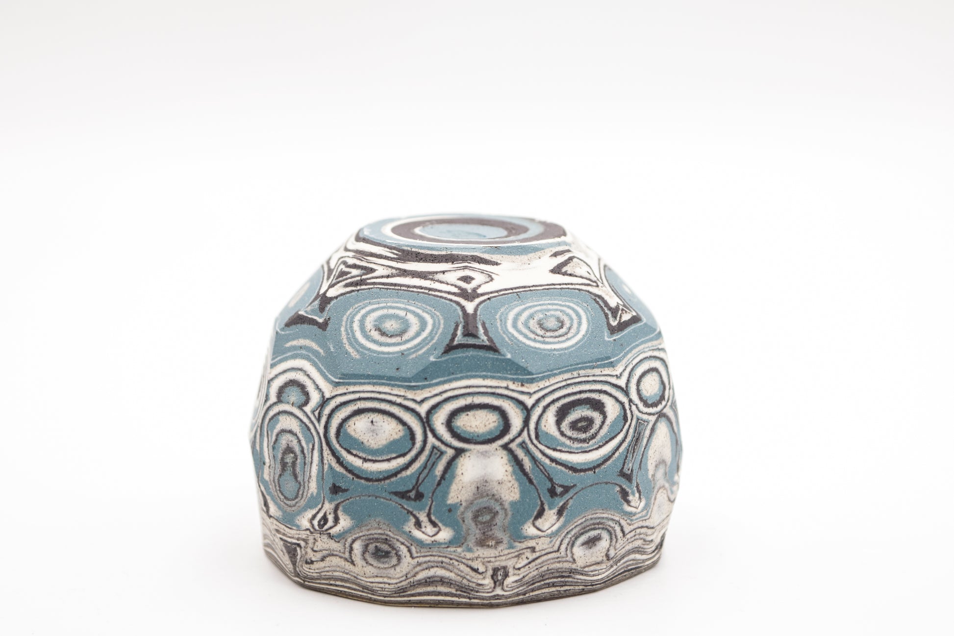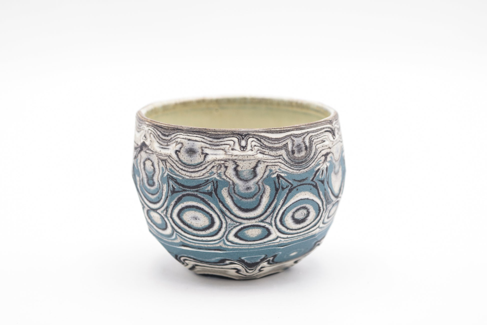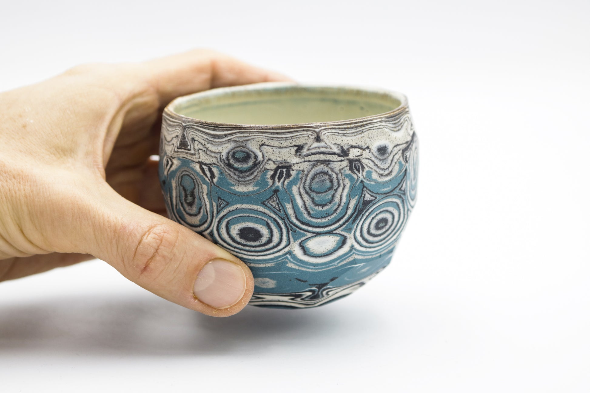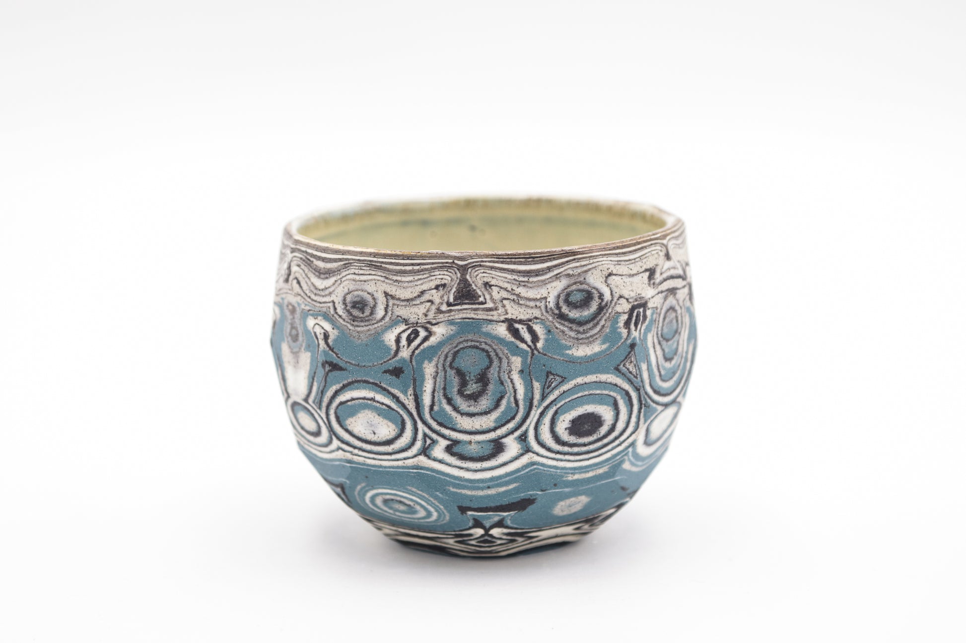 Hand thrown and cut, black, white, grey and blue mixed stoneware cup.