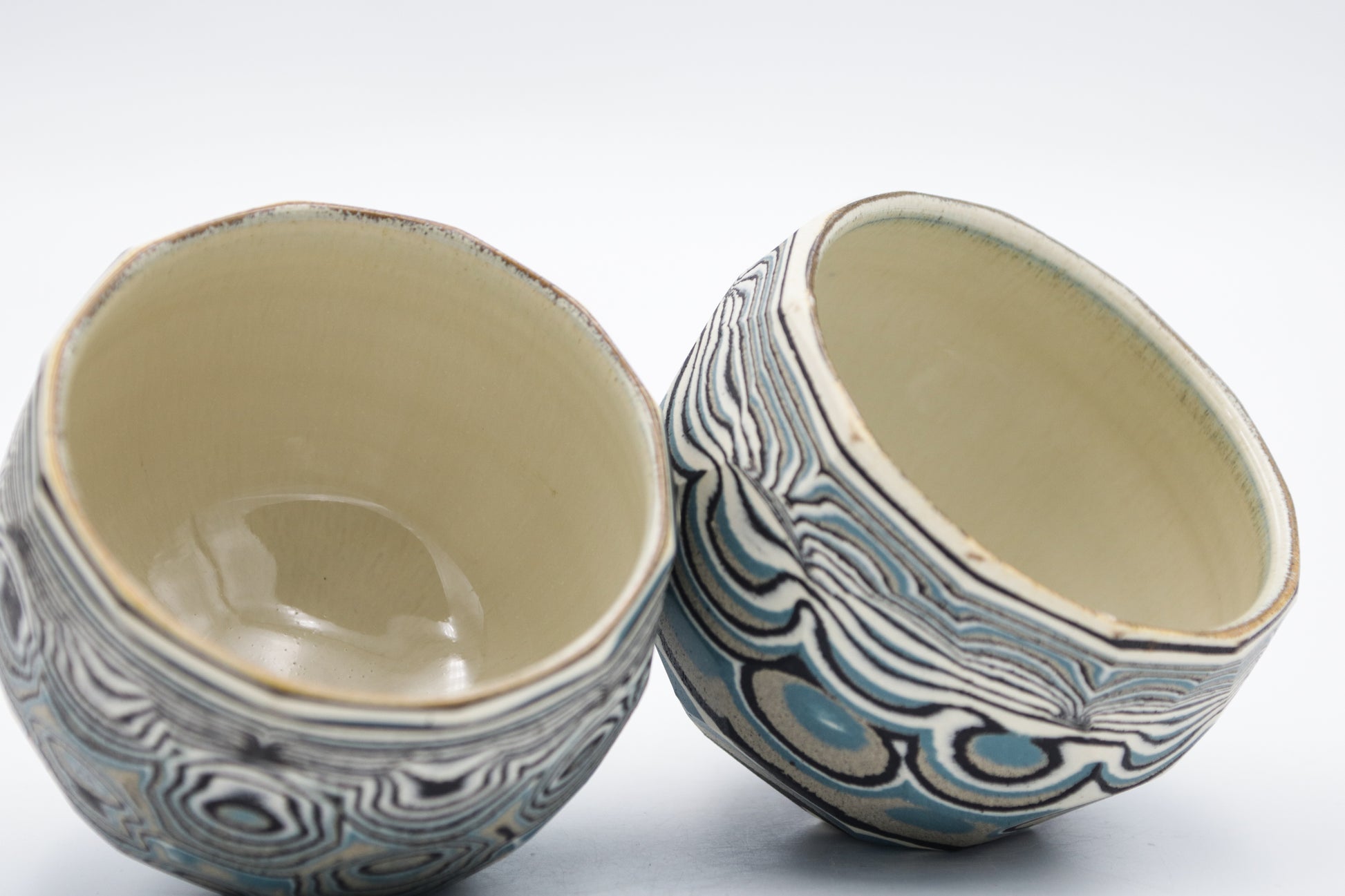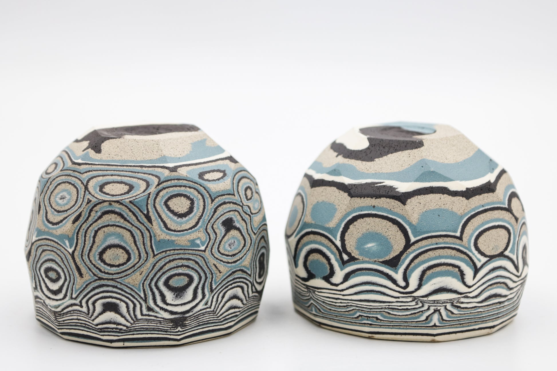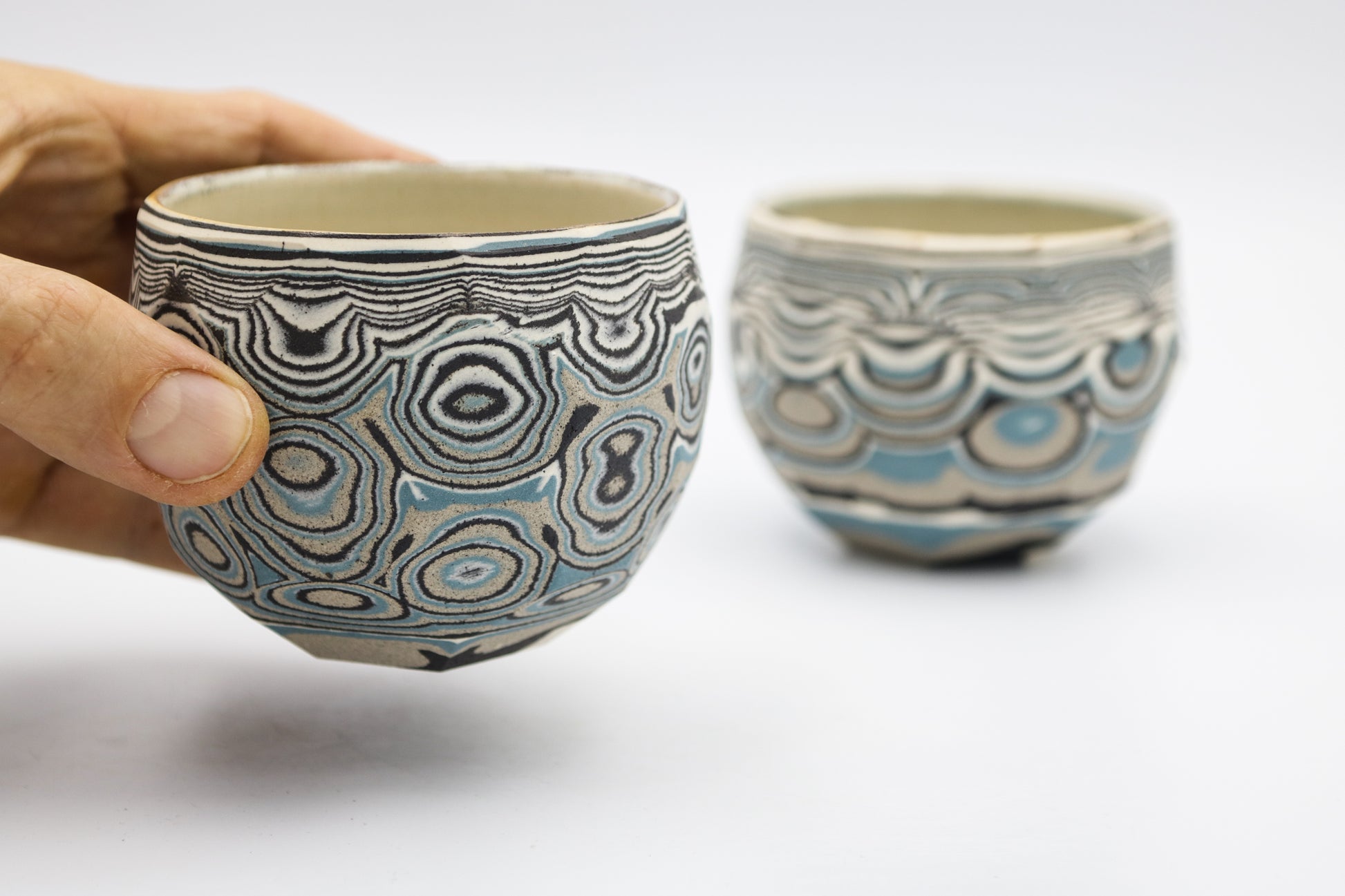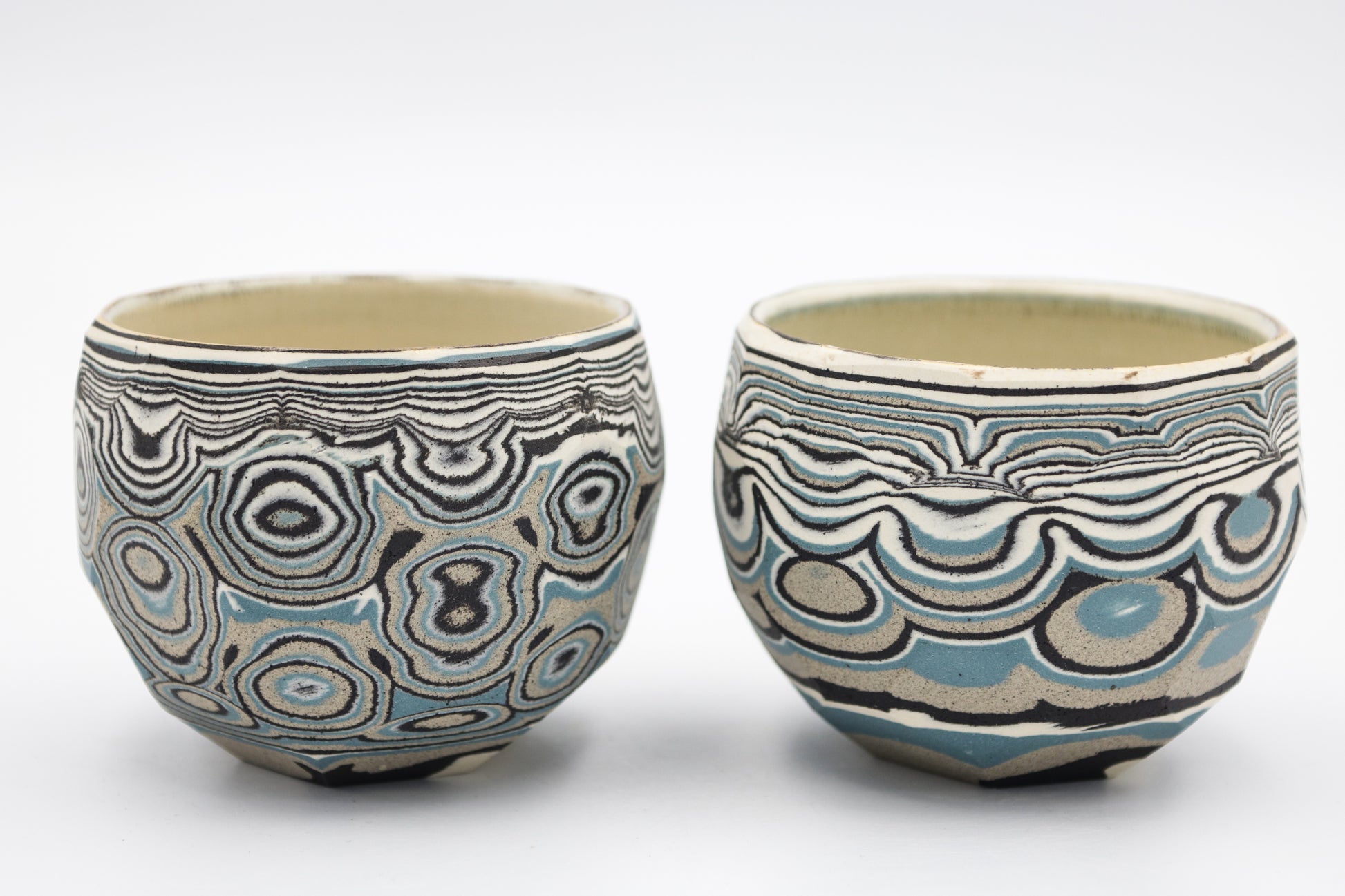 Hand thrown and cut, black, white, gray and blue mixed stoneware cup set of two.