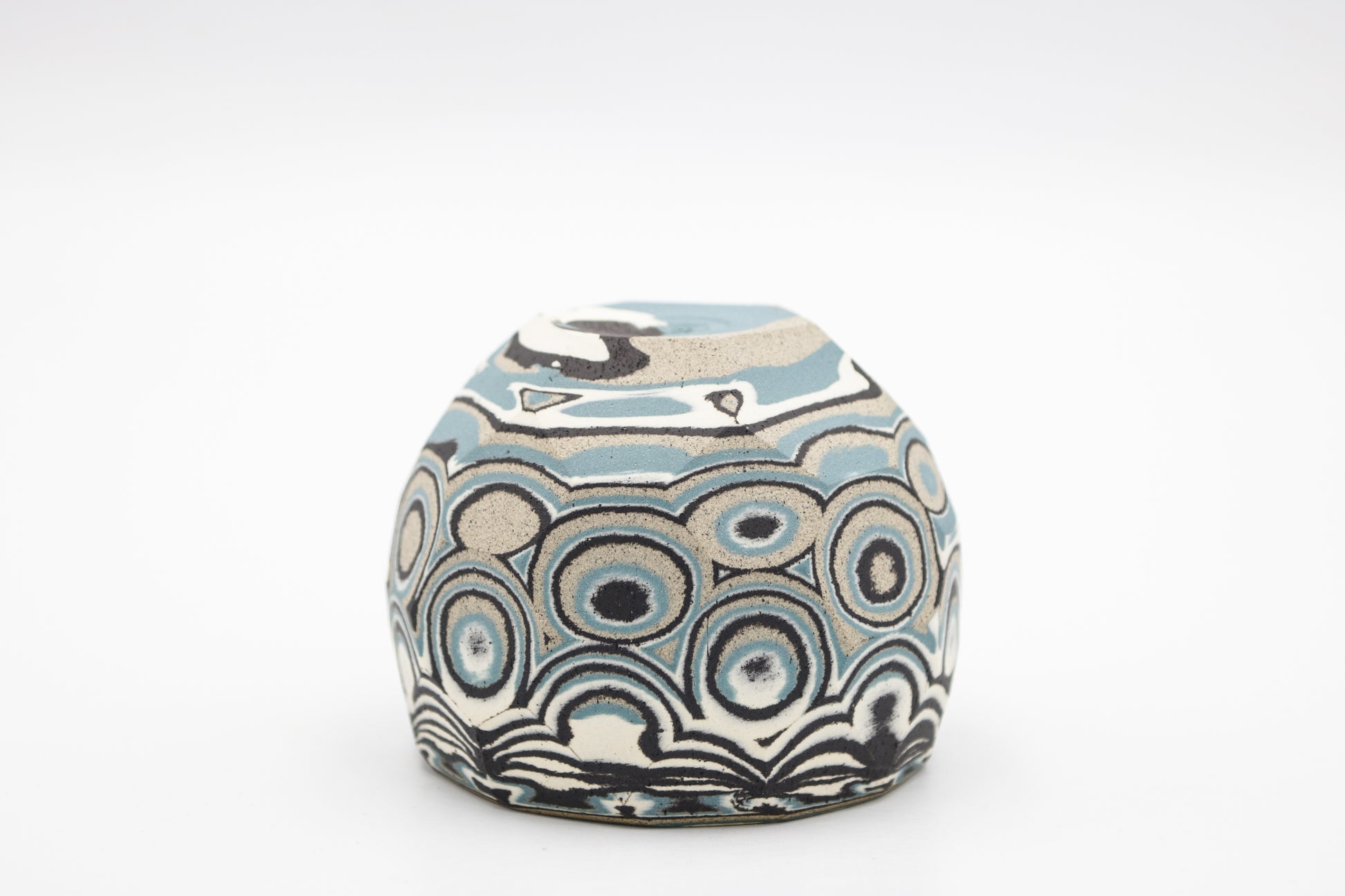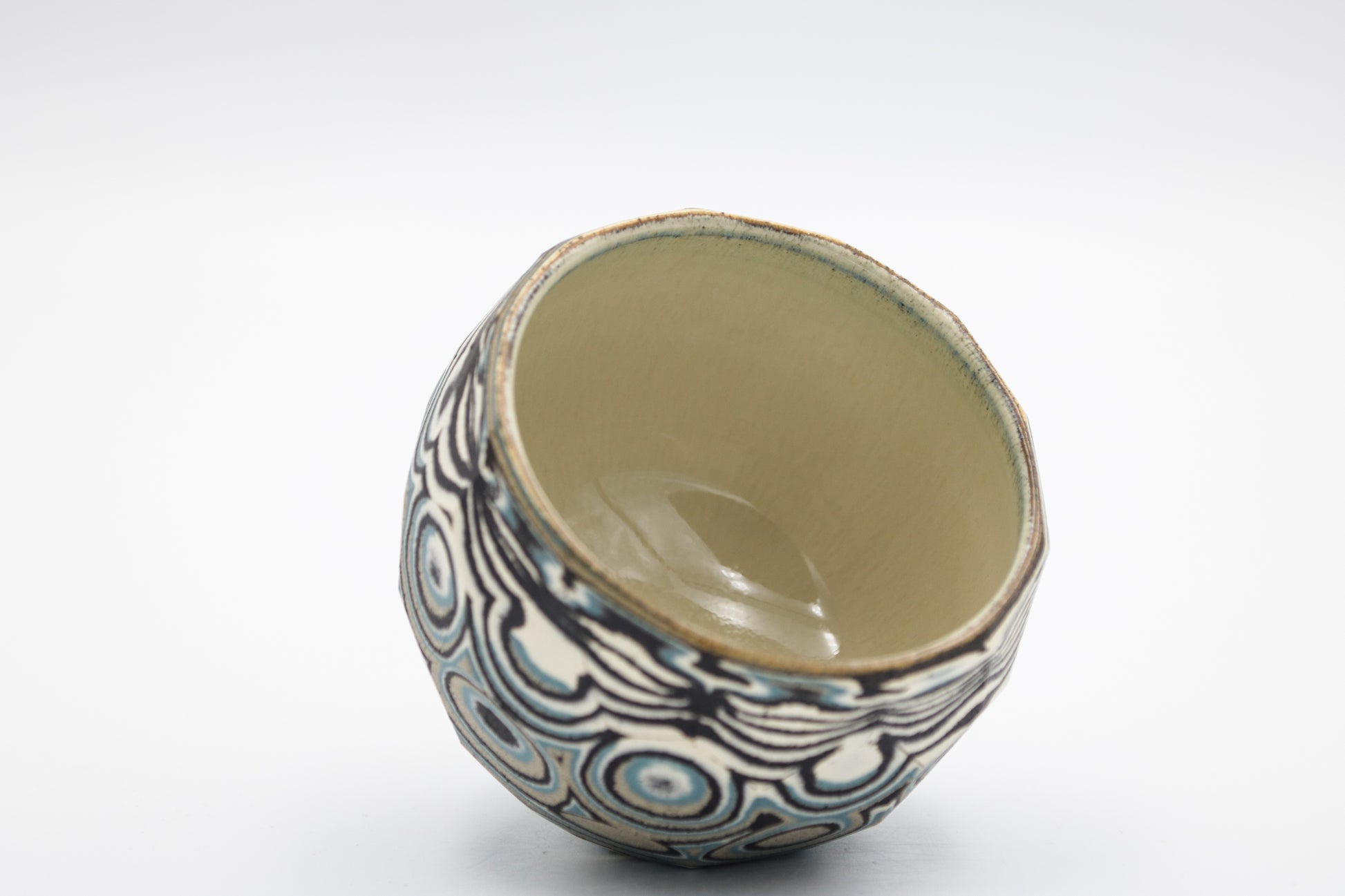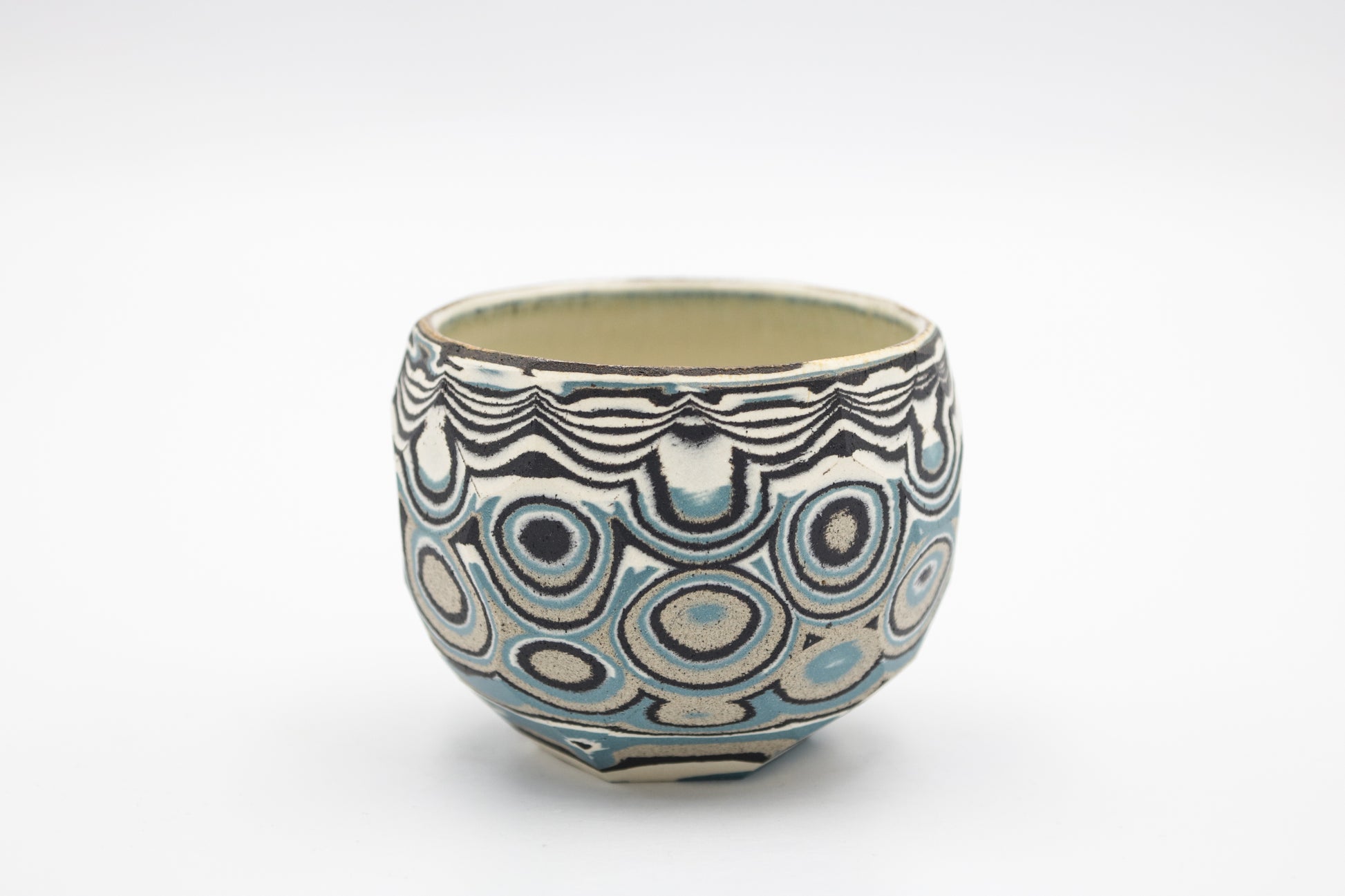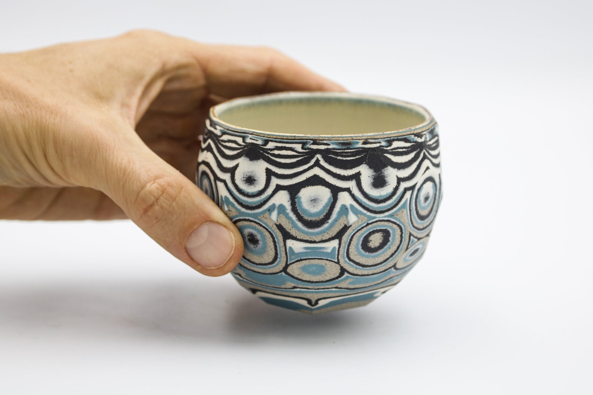Hand thrown and cut, black, white, gray and blue mixed stoneware cup.