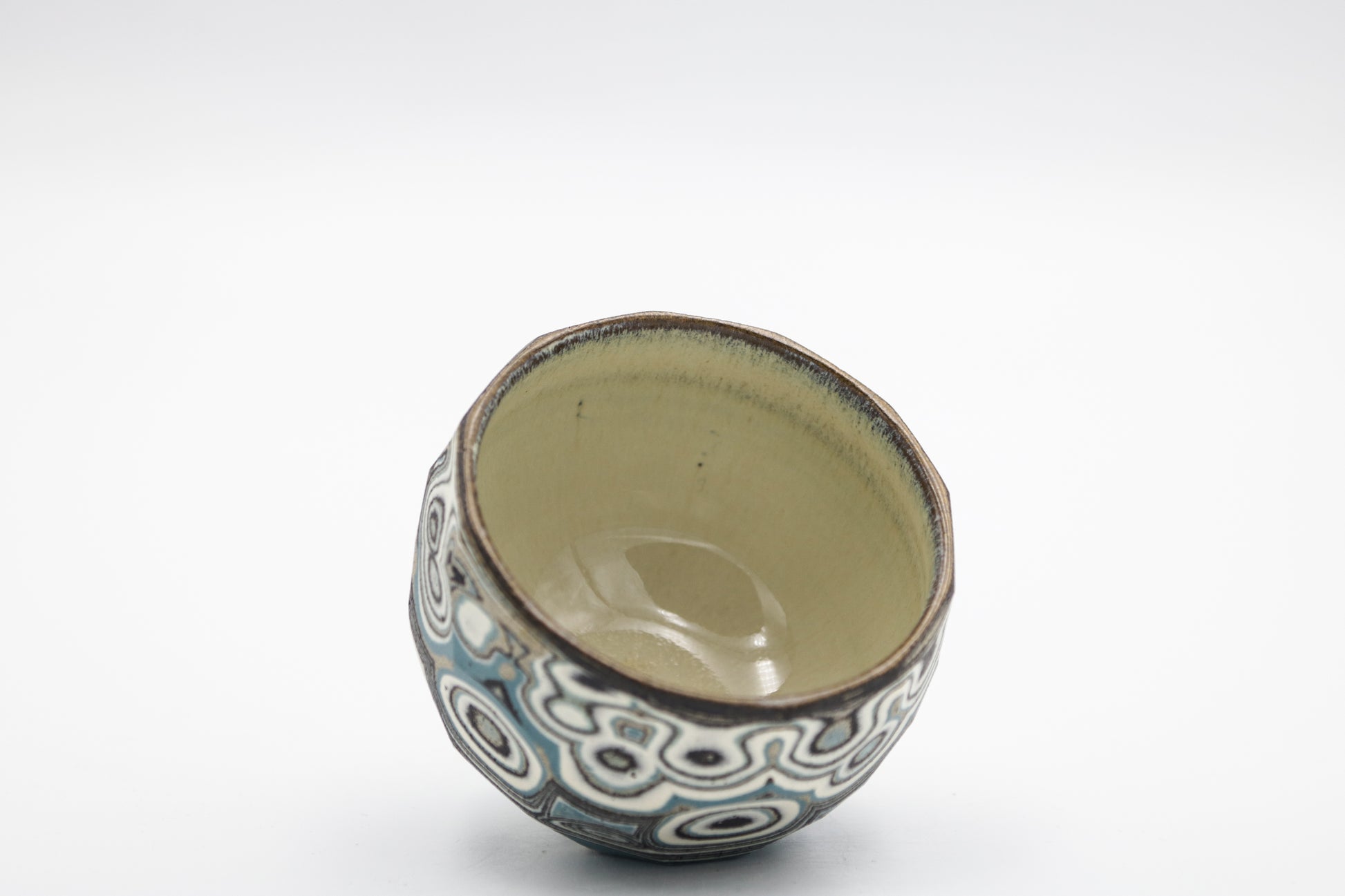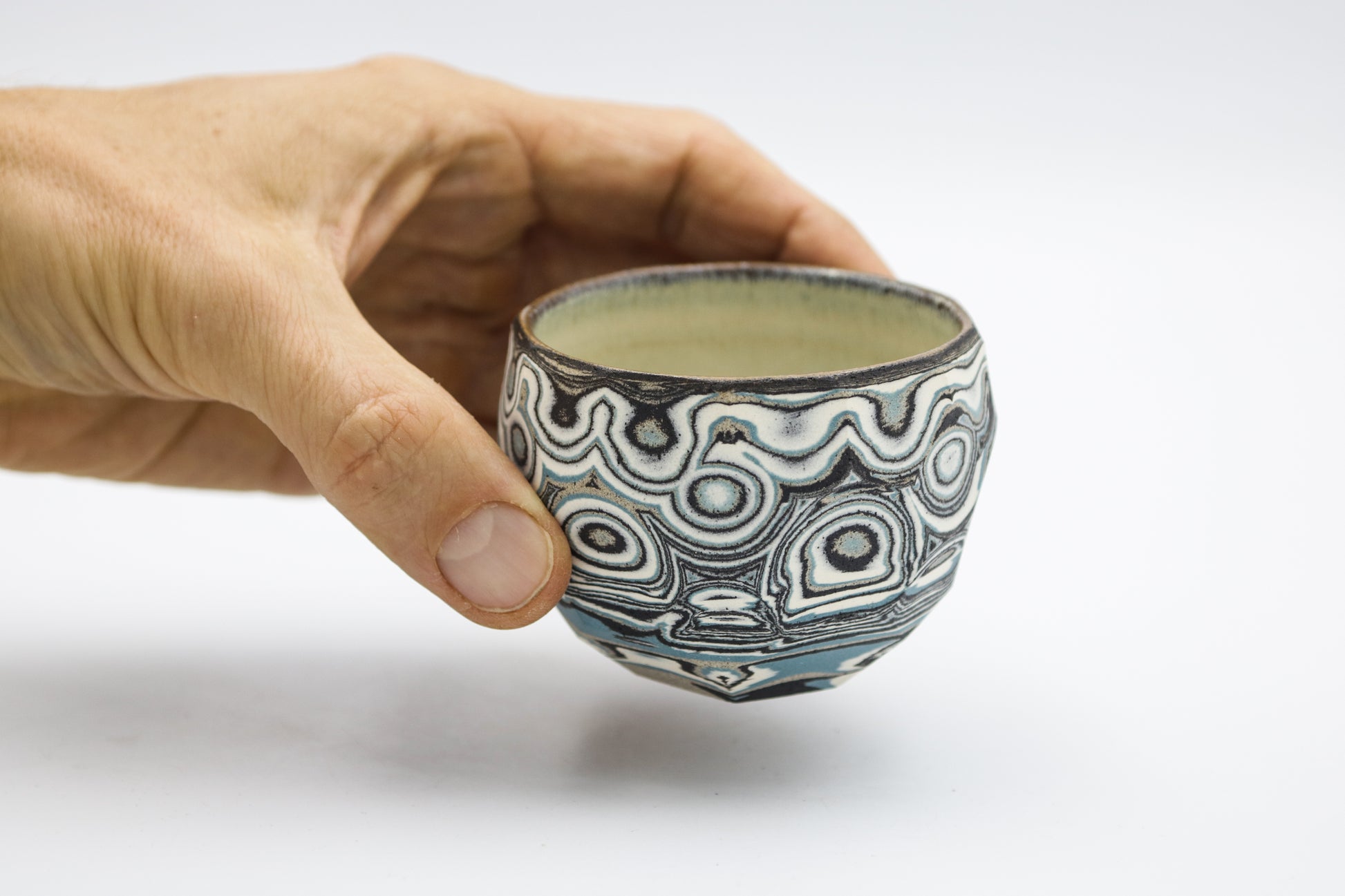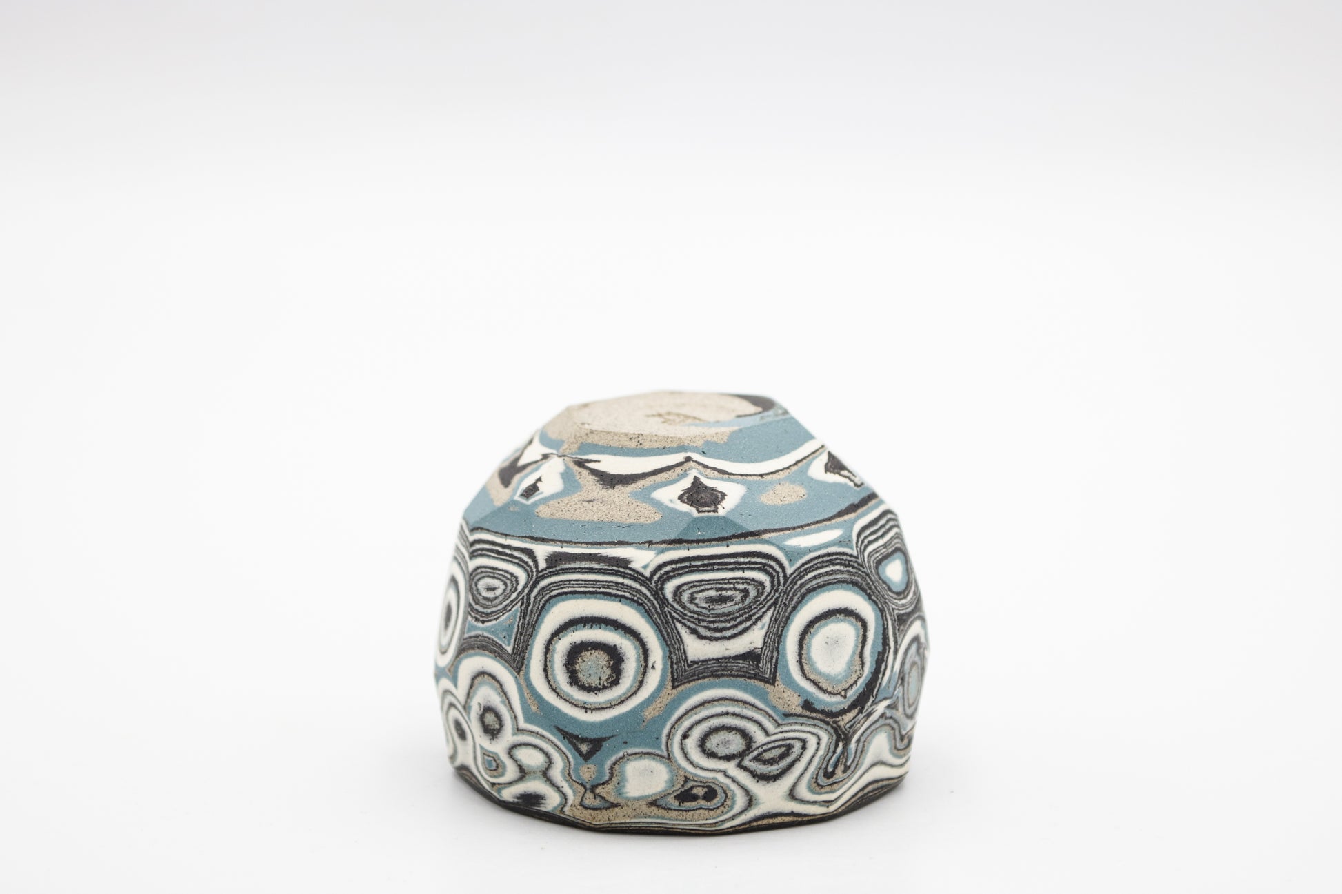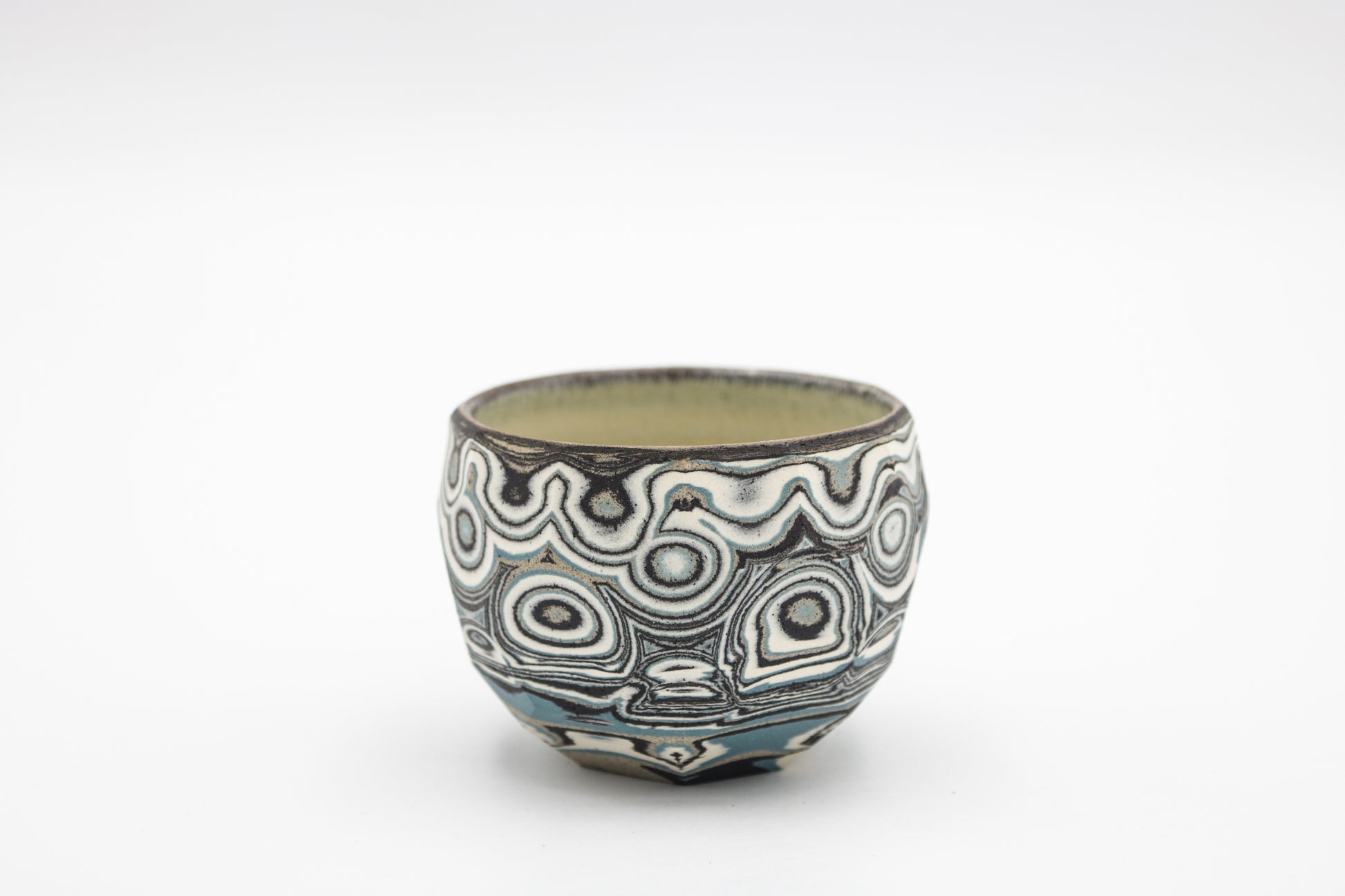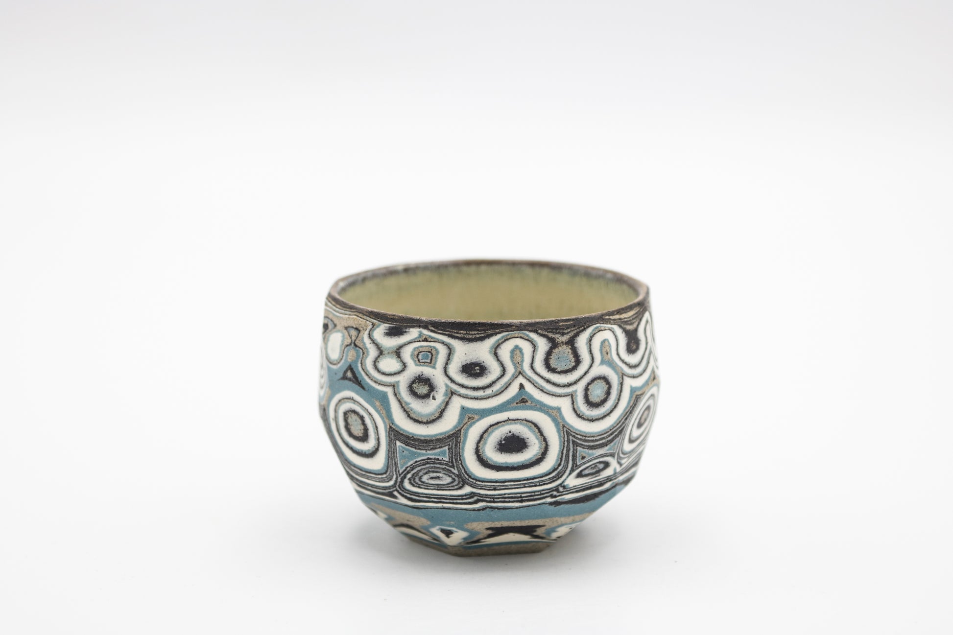 Hand thrown and cut, black, white, gray and blue mixed stoneware cup.