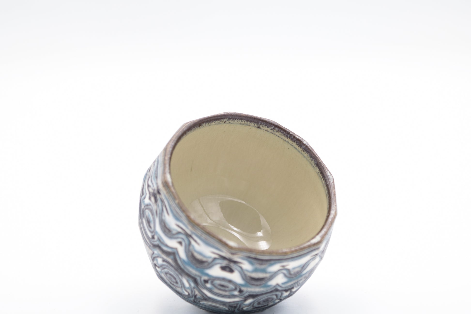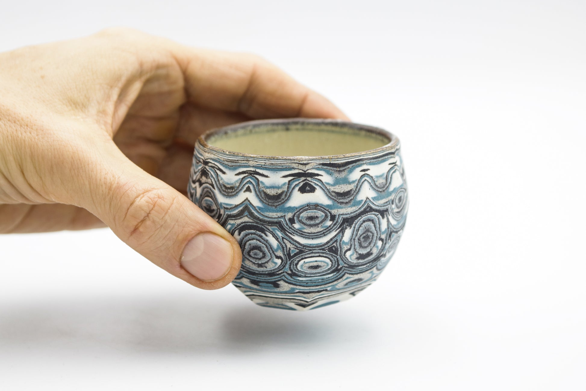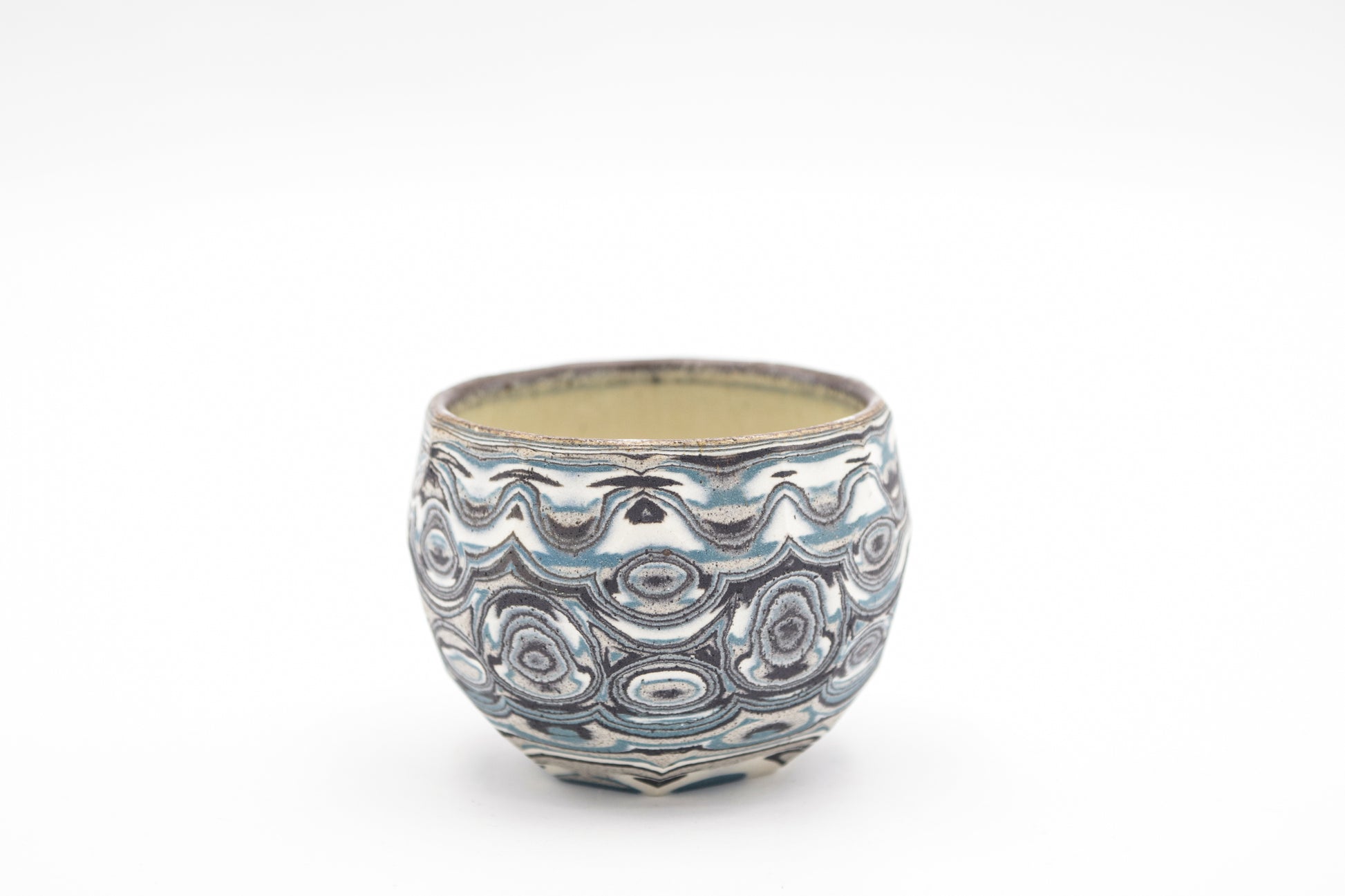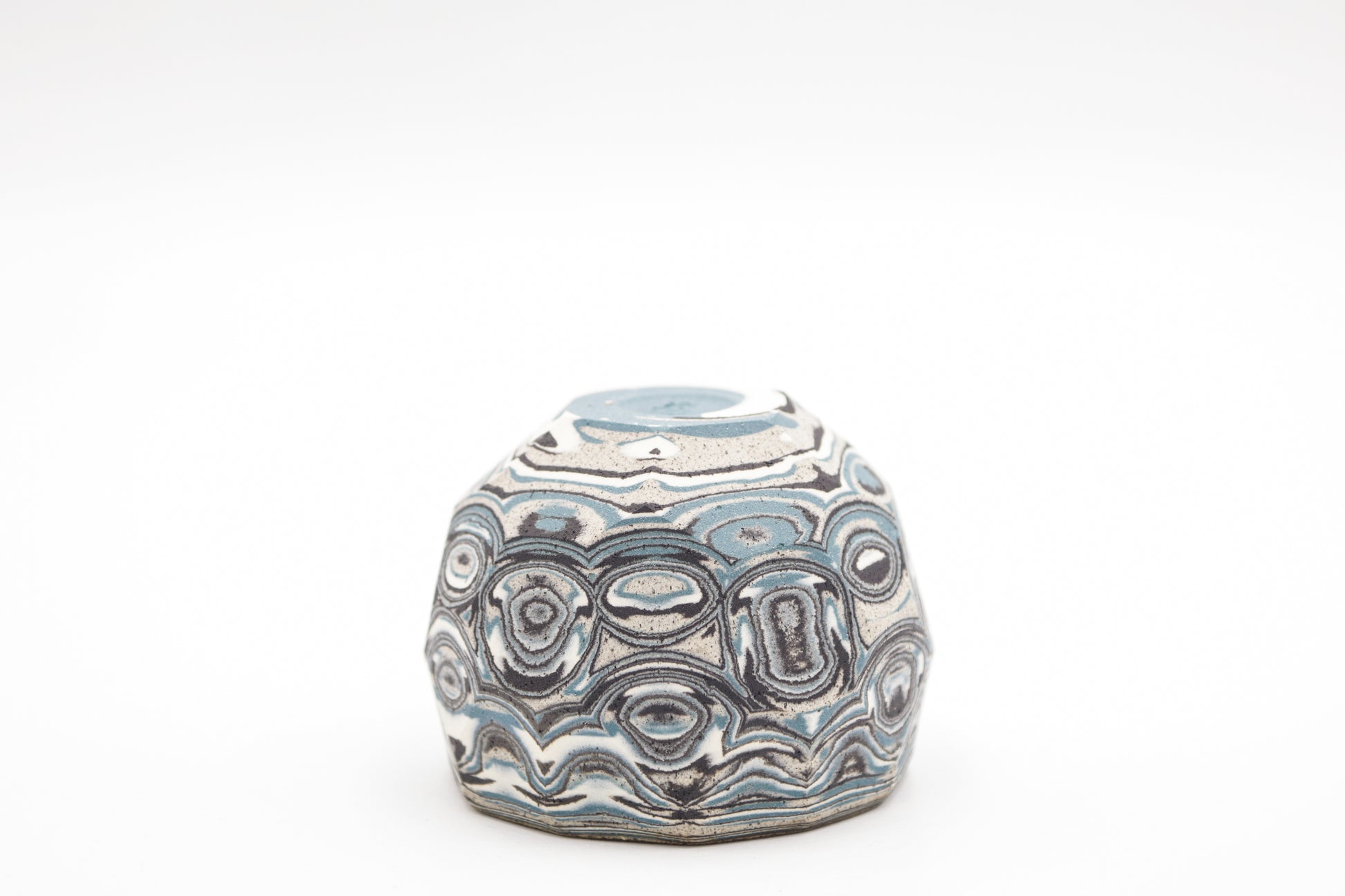 Hand thrown and cut, black, white, gray and blue mixed stoneware cup.