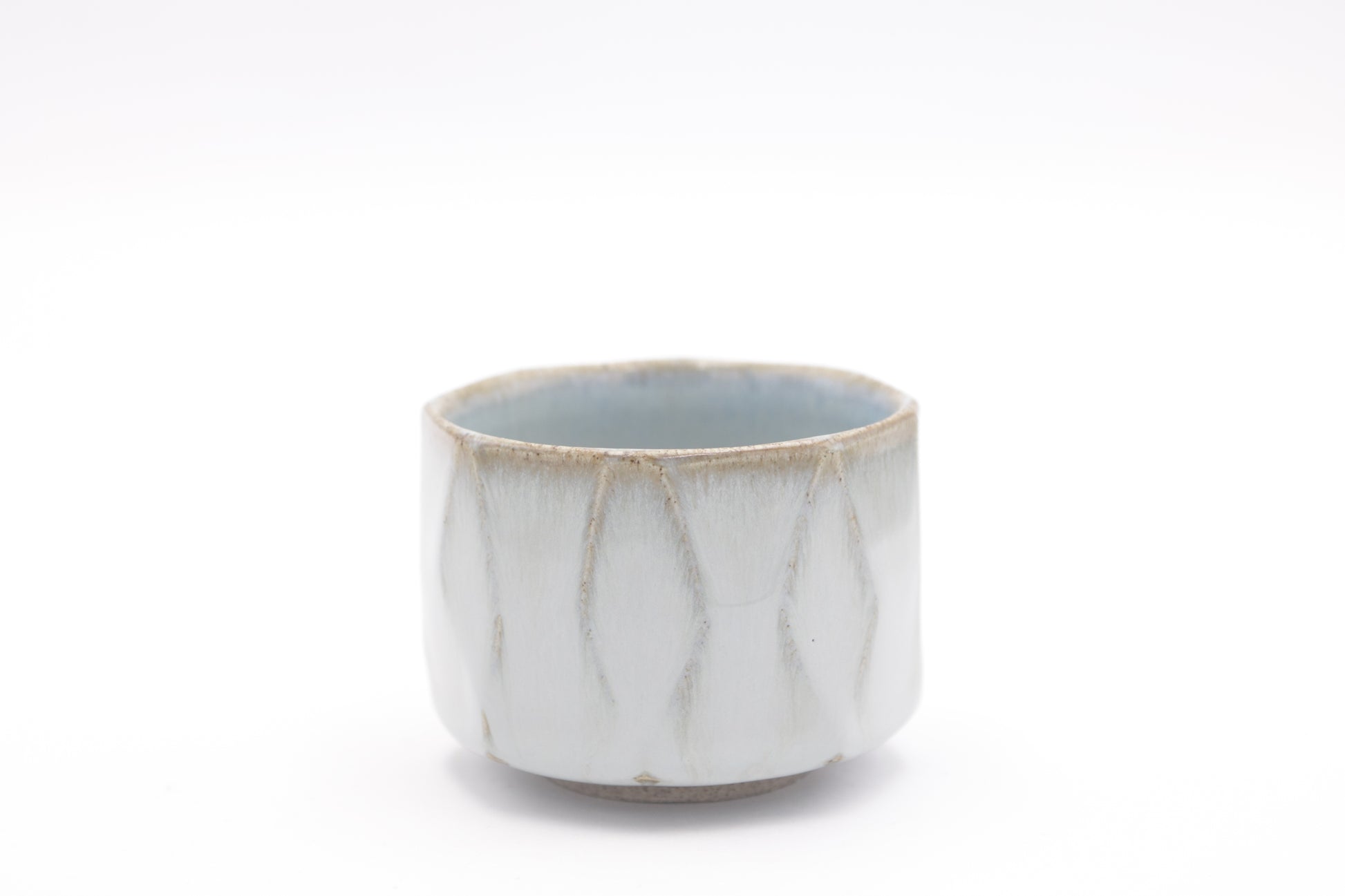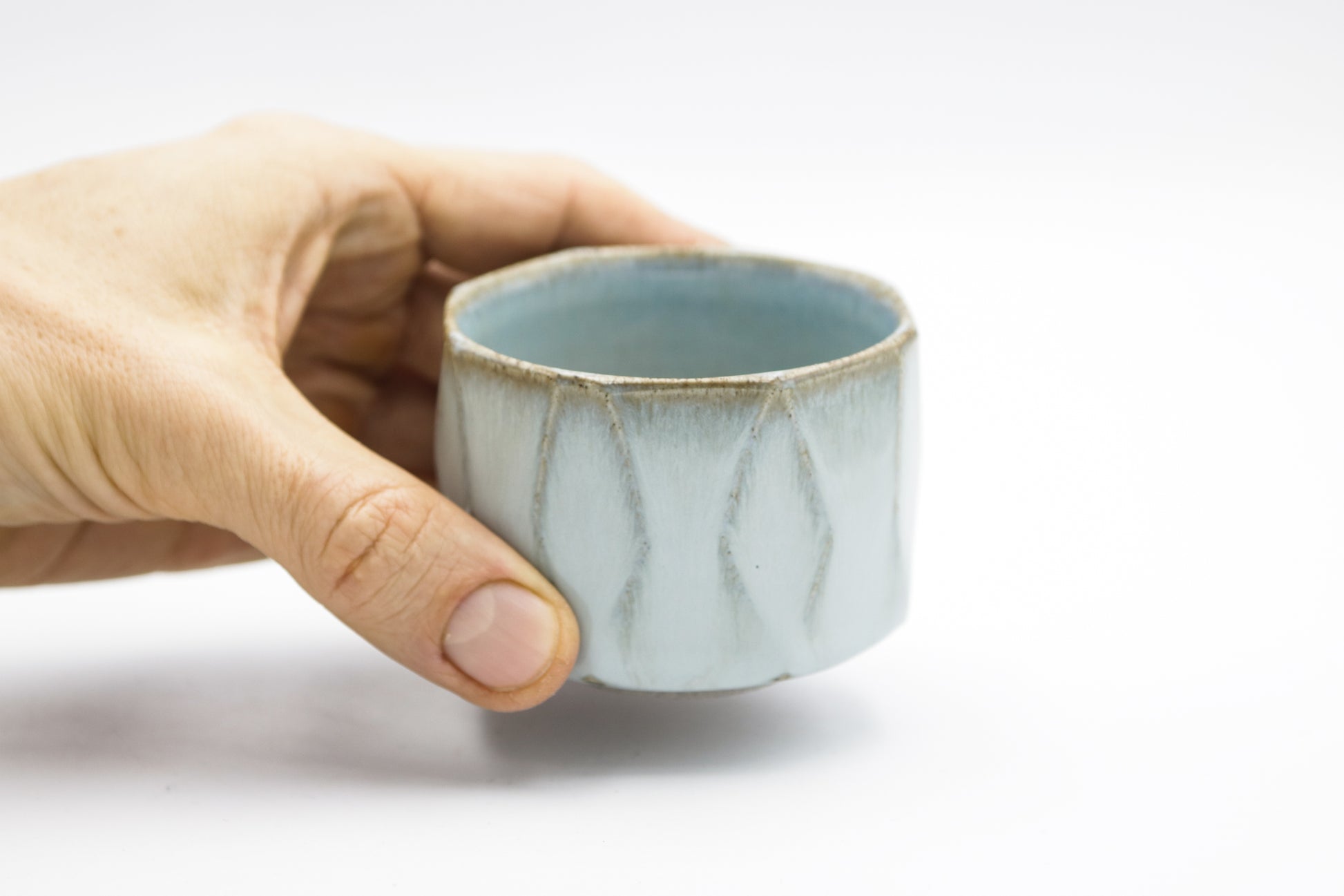 Hand thrown and cut stoneware cup. Glazed inside and outside. Each piece might be slightly different due to the handmade process.