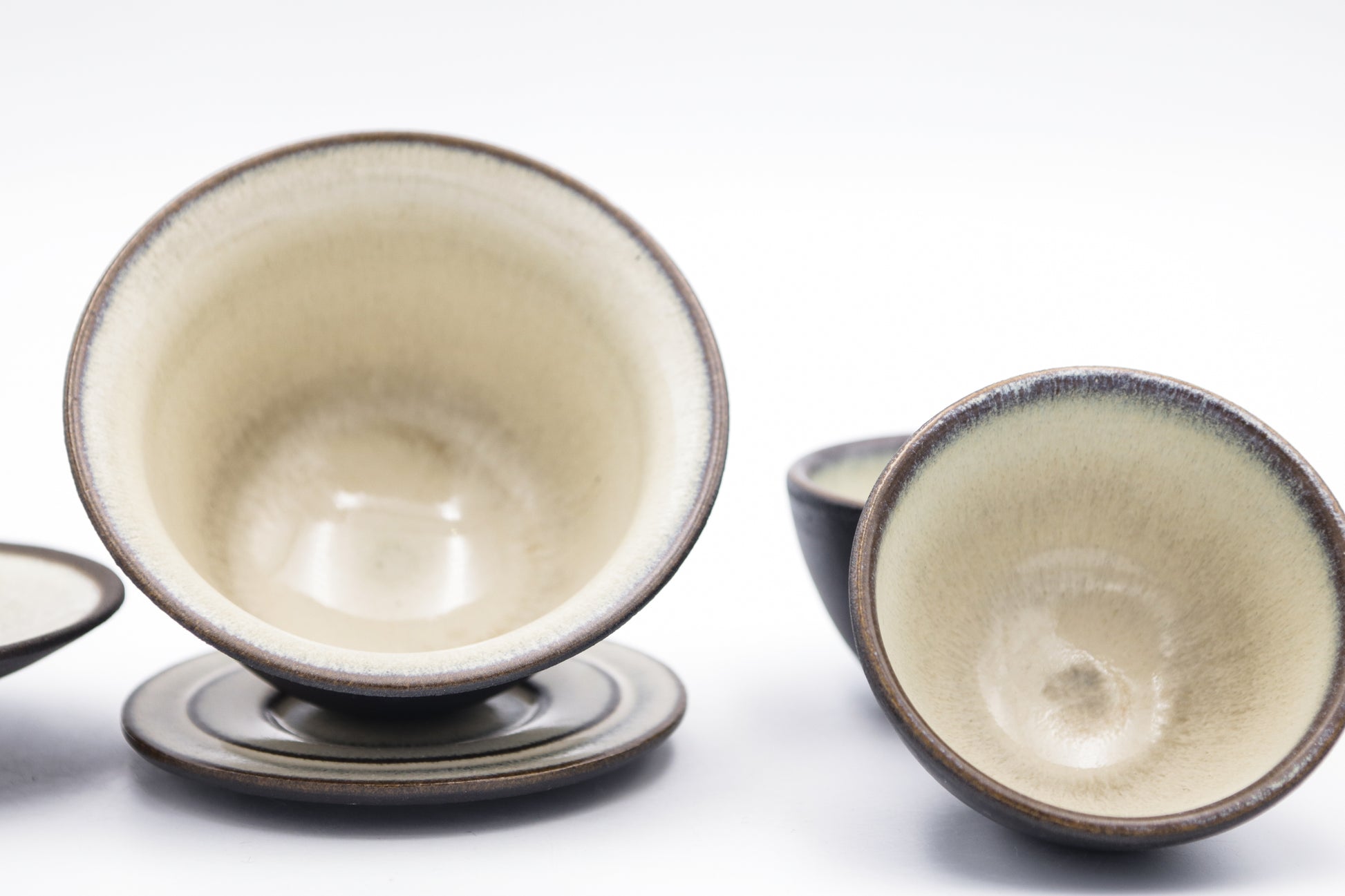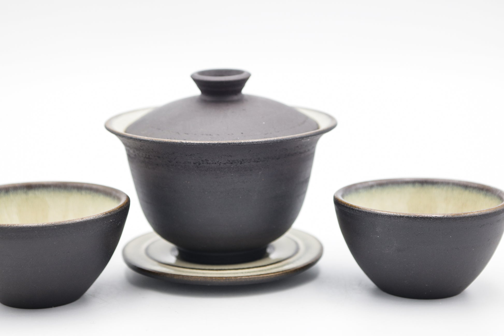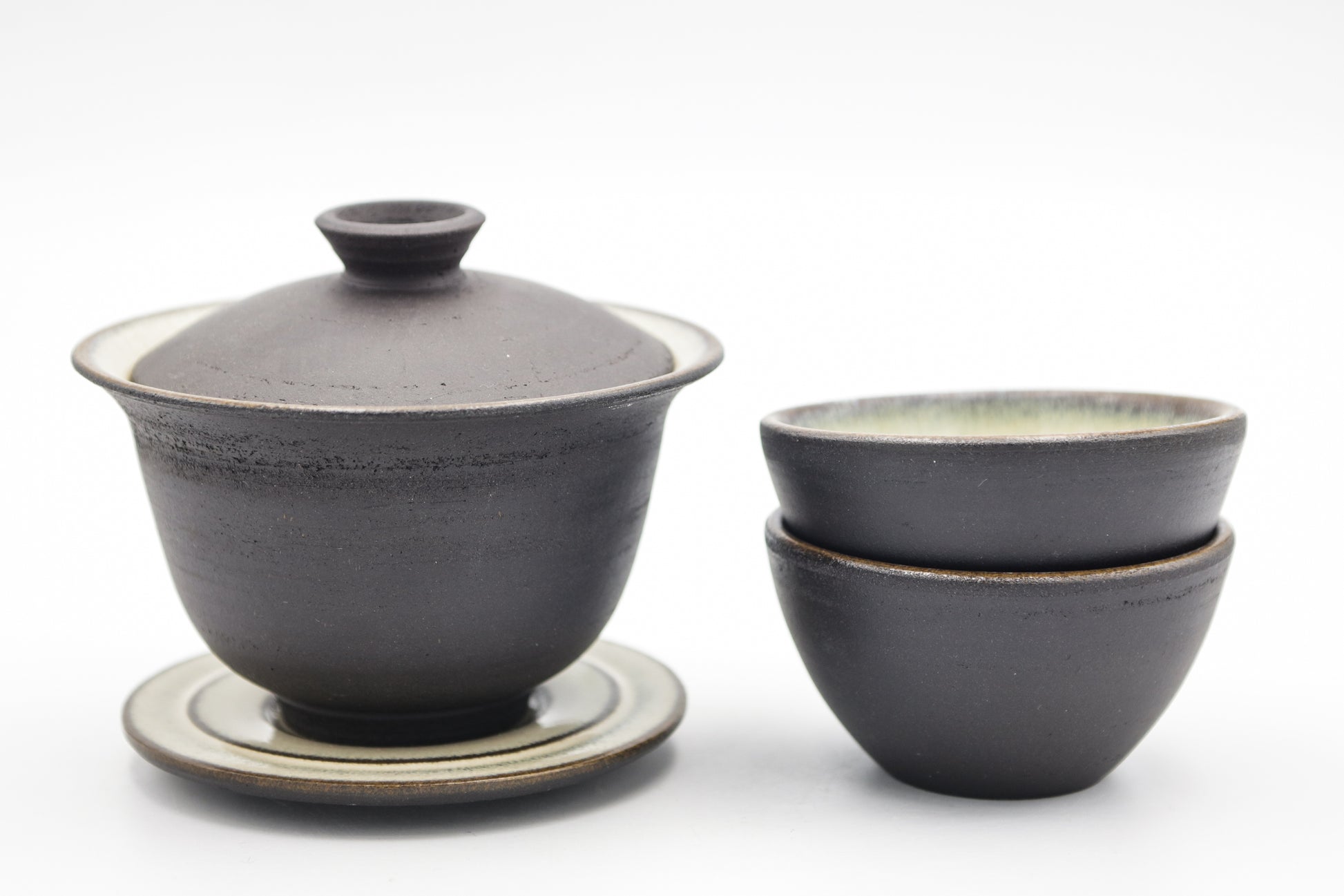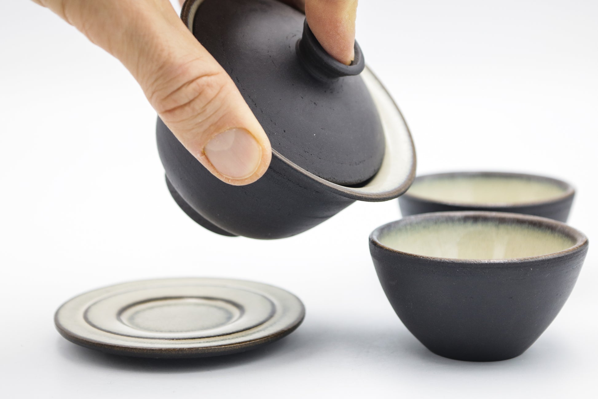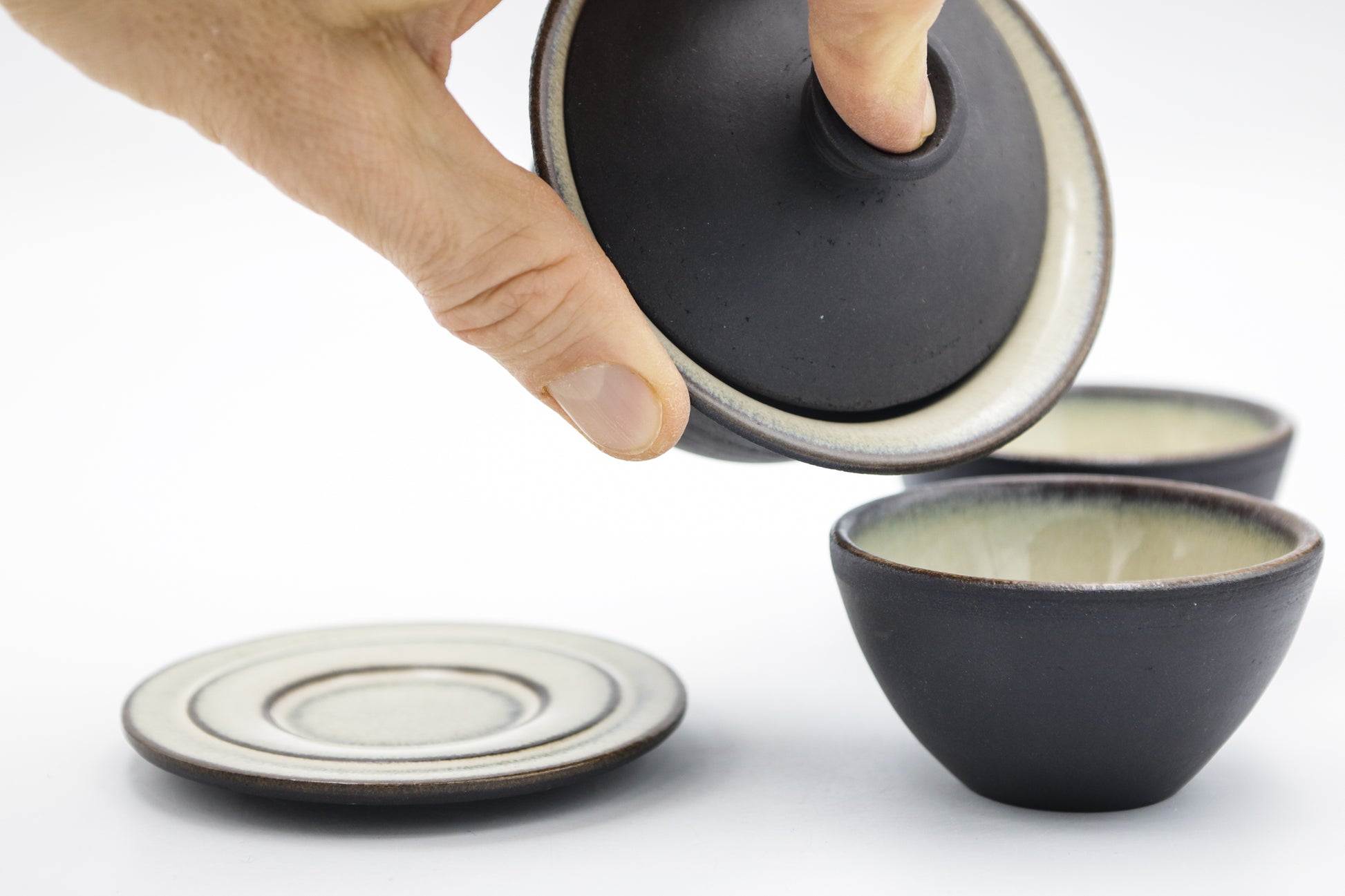 Set contains a hand thrown black gaiwan, with two hand thrown mini cups. Glazed inside only.